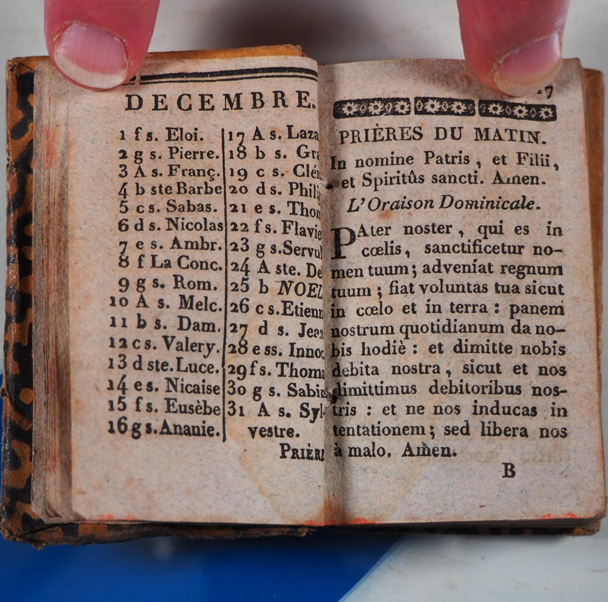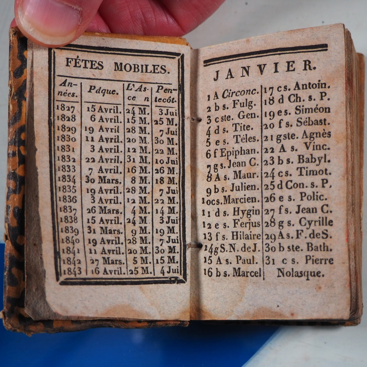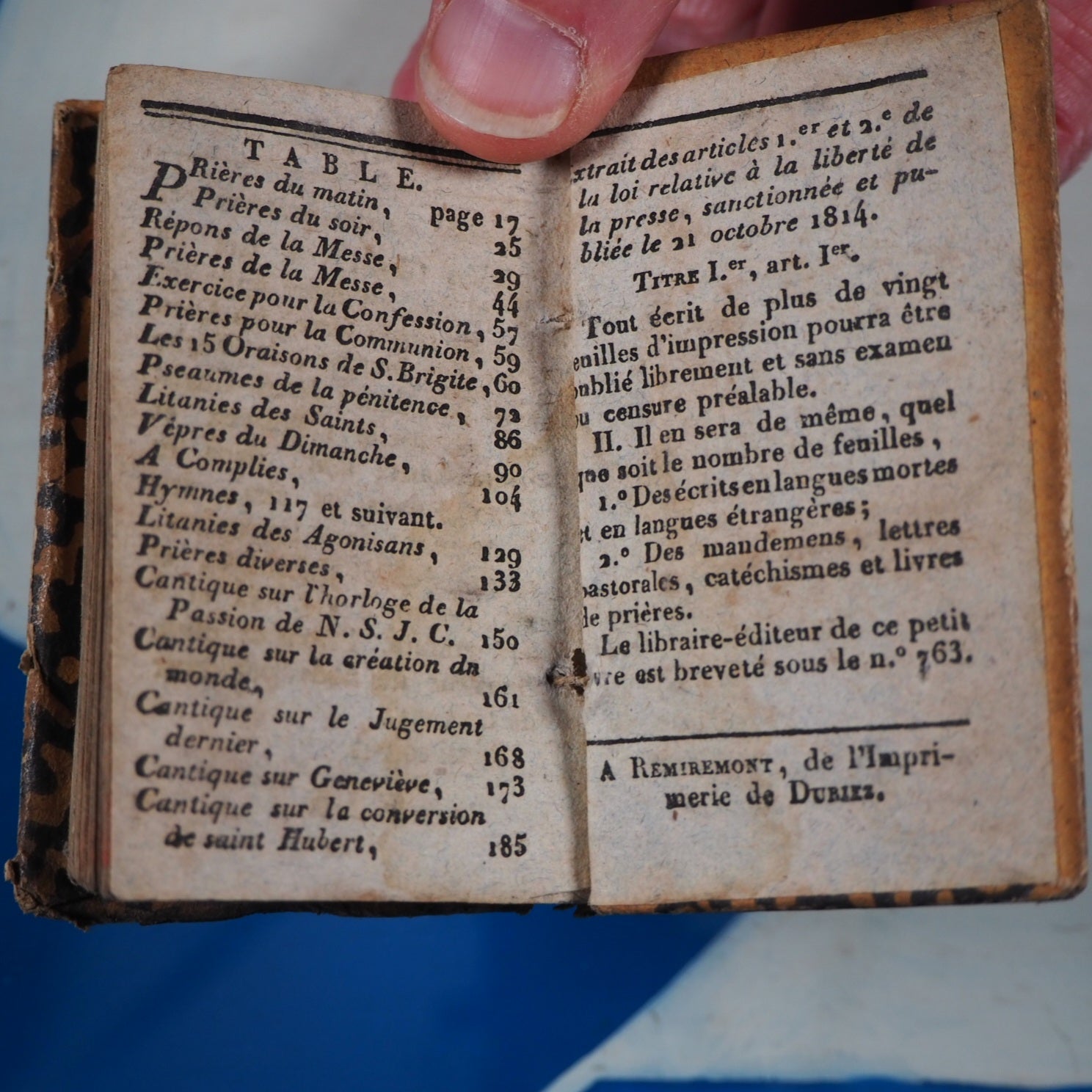 186 printed pages (sporadic, marginal small stains and mild, general age-toning), woodblock frontispiece. First and last leaves pasted down to boards by original binder. 2.1 x 3.2". Original boards covered with contemporary block printing -this type of decorated paper was used for many other common household purposes, such as containers for sugar and medicinal powder- (slightly rubbed, worn at hinges and corners). Jauffret was a French bishop and theologian who supported Napoleon with the divorce of his first wife & through his was promised the Archbishopric of Aix but who died in 1823 as just a bishop. Printed at Remiremont, Imprimerie de Duriez. Welsh only lists an example of a different edition, published 7 years later in 1834 and held in her own collection. Welsh, 44. Not in Bondy, nor in Spielmann. WorldCt also locates a miniature copy dated 1834 Imprimerie de J. Chanson, Cambrai. This edition was reprinted in 1830 with an identical printing apart from a different frontispiece -I have an incomplete copy in my collection. So this copy may be a rare example of the earliest recorded miniature edition of this prayer book. Seller Inventory # 5272