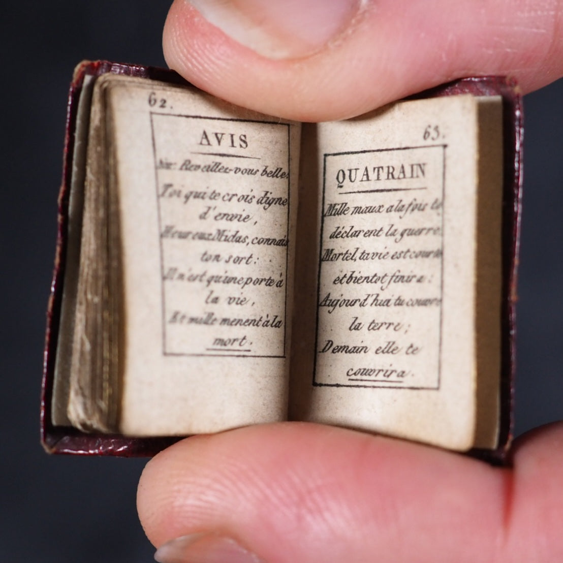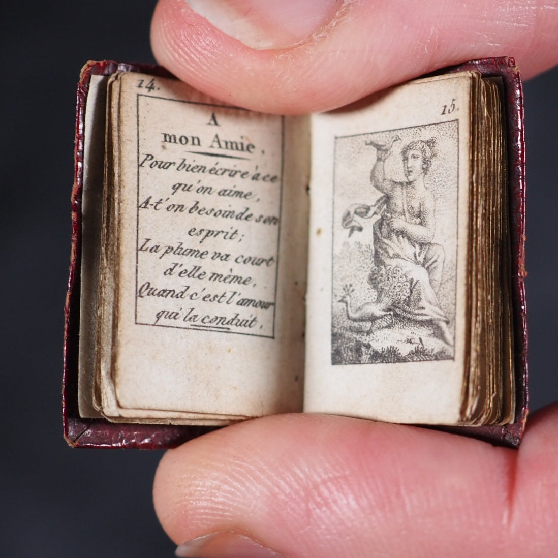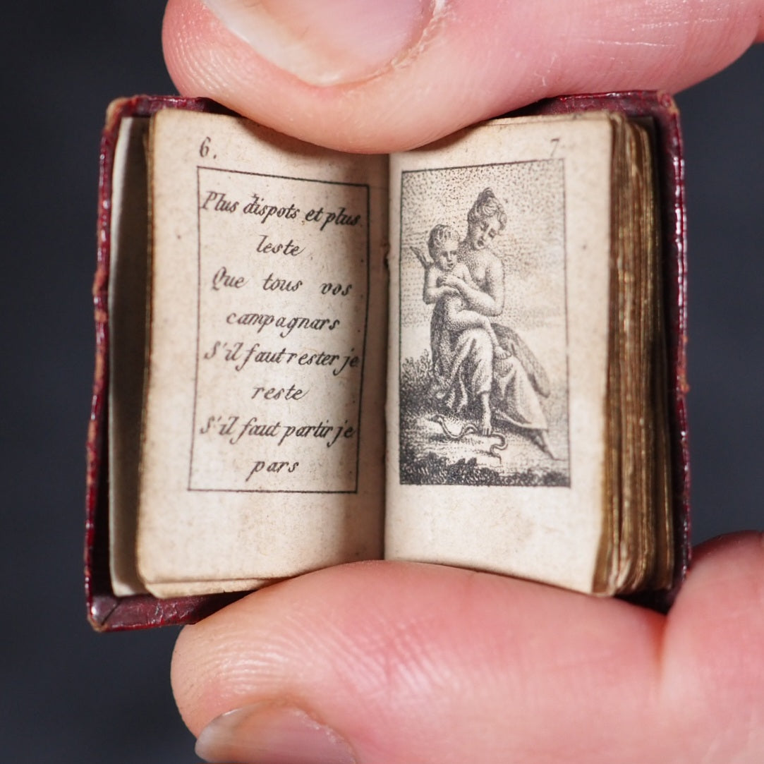Le Petit Echo de Momus. 1816. Le Fuel. Paris. 1815. 64 printed pages in French (some pages slightly thumbed). Engraved throughout. Illustrated with 12 stipple-engraved full-page plates. Calendar inserted at the centre of the volume. 20 x 30 mm. Original red morocco; covers with scrolling floral gilt borders and central gilt eight- flowered circular motif; spine with same floral scrolls borders (spine slightly worn and with minuscule historic repair at top). Not in Spielmann, nor Bondy. Grand-Carteret, 1780. Houghton, 337. Welsh, 5567. Not found in WorldCat. 175 firsts2024