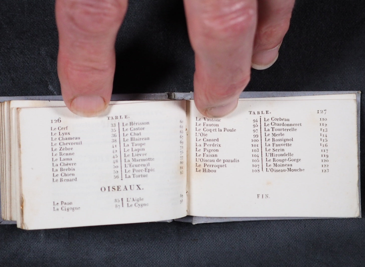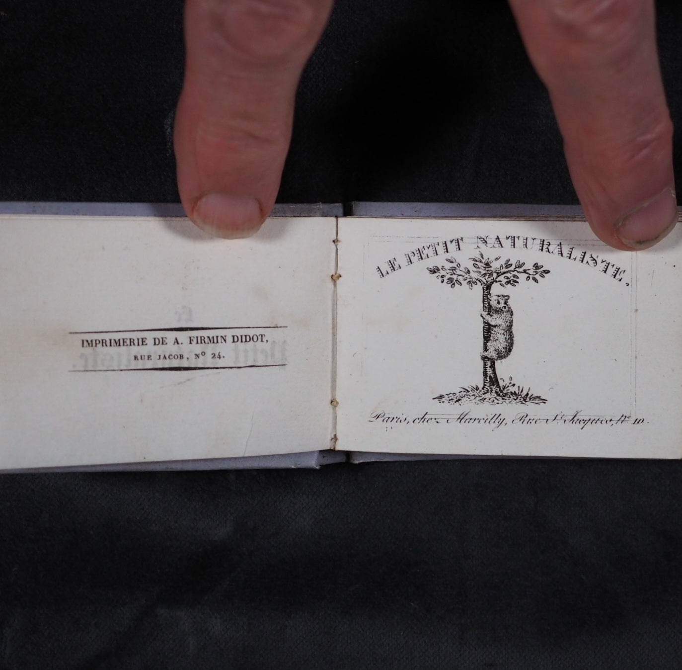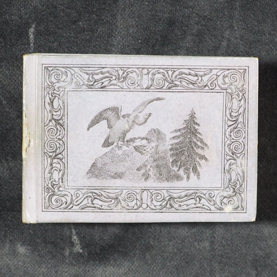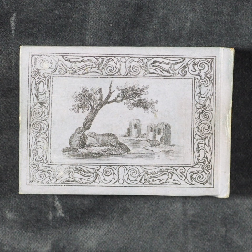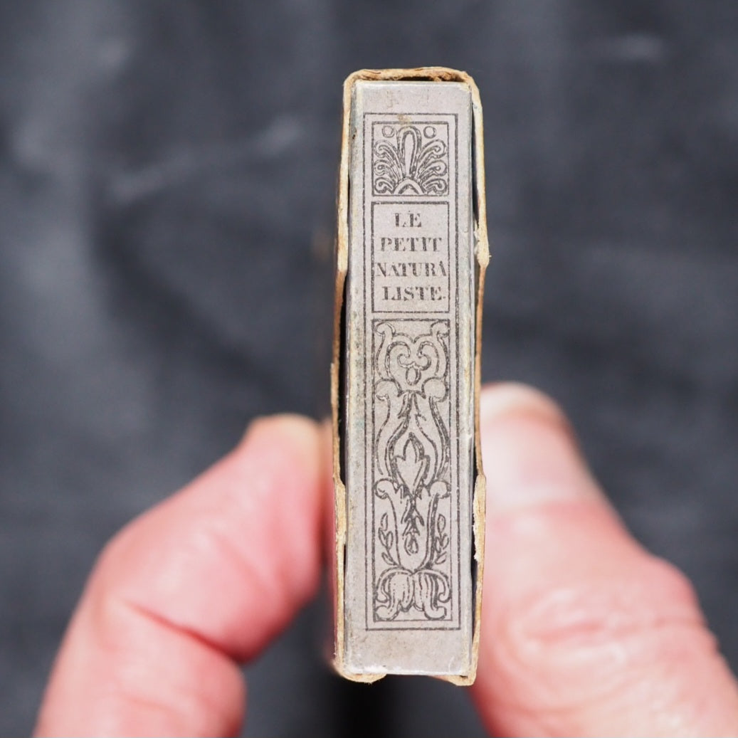 Le Petit Naturaliste. Marcilly. Rue St. Jacques, no. 10. Paris. 1829. No date but 1829. 128 printed pages in French (extremely light spotting). 12 plates. Printed by A. Firmin Didot. All edges gilt. Contemporary ink inscription on front paste-down endpaper. Provenance: Isabella Newcombe. 68 x 50mm. Original purple card; printed in black with 'Le Petit Naturaliste' on spine below anthemion and above foliage motifs; front cover with image of an eagle above the tree-line on a mountain top, within elaborate scrolling border; back cover with two pairs of beavers (very slightly worn down the spine). Complete with original matching printed slipcase; printed with black design of a fox on the front and an elephant on the back; faded, rubbed and a little worn at edges. Gumuchian, 4127. Houghton, 118. Nauroy, 74. Welsh, 5582. Not in Bondy, nor Spielmann. WorldCat locates a total of 6 complete and one imperfect copies, none in the UK. OCLC, 460828770. 116 firsts2024