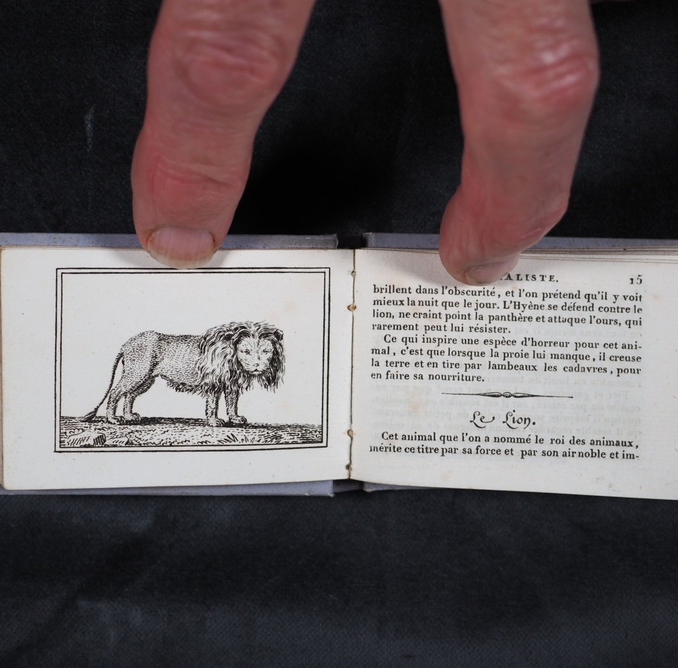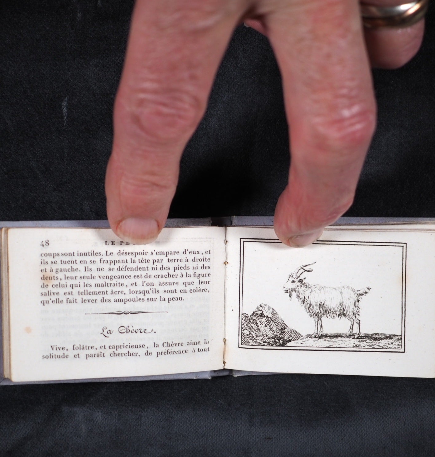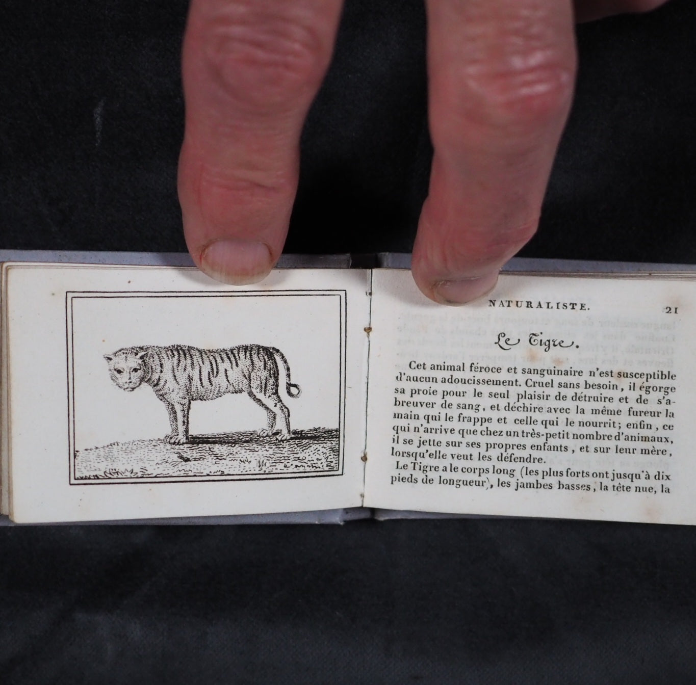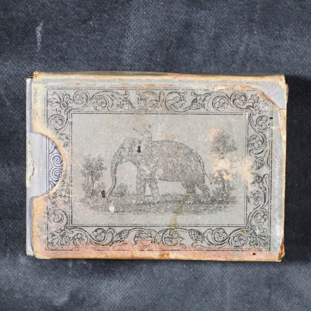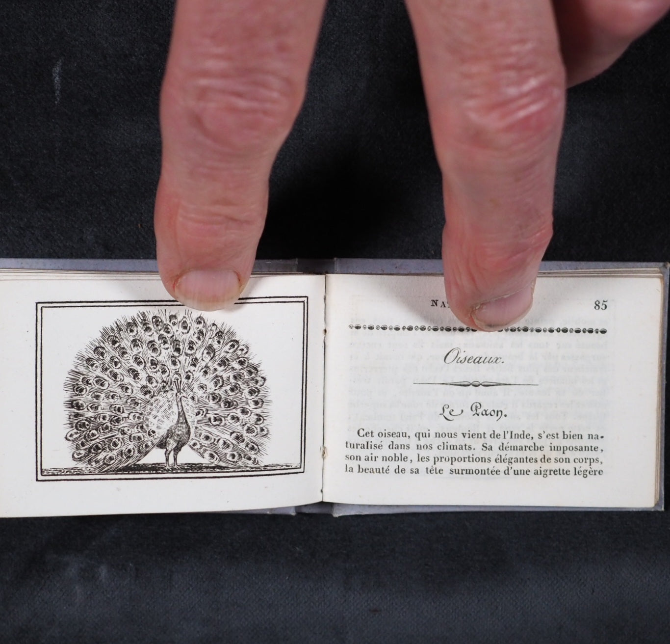 Le Petit Naturaliste. Marcilly. Rue St. Jacques, no. 10. Paris. 1829. No date but 1829. 128 printed pages in French (extremely light spotting). 12 plates. Printed by A. Firmin Didot. All edges gilt. Contemporary ink inscription on front paste-down endpaper. Provenance: Isabella Newcombe. 68 x 50mm. Original purple card; printed in black with 'Le Petit Naturaliste' on spine below anthemion and above foliage motifs; front cover with image of an eagle above the tree-line on a mountain top, within elaborate scrolling border; back cover with two pairs of beavers (very slightly worn down the spine). Complete with original matching printed slipcase; printed with black design of a fox on the front and an elephant on the back; faded, rubbed and a little worn at edges. Gumuchian, 4127. Houghton, 118. Nauroy, 74. Welsh, 5582. Not in Bondy, nor Spielmann. WorldCat locates a total of 6 complete and one imperfect copies, none in the UK. OCLC, 460828770. 116 firsts2024