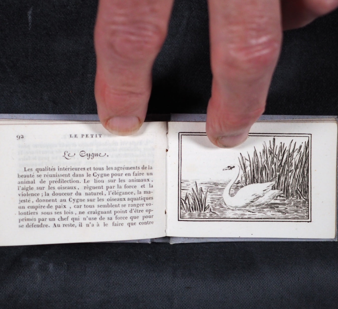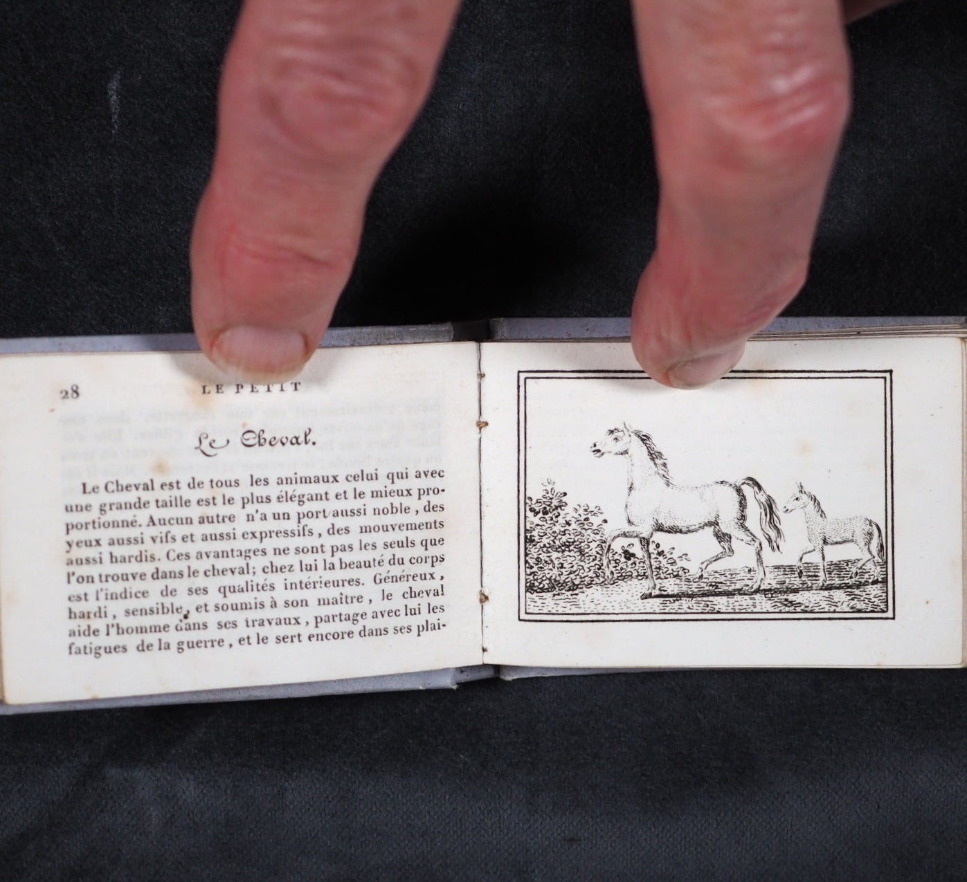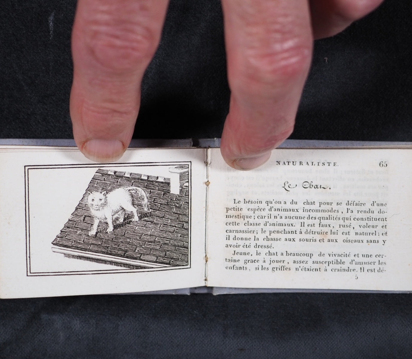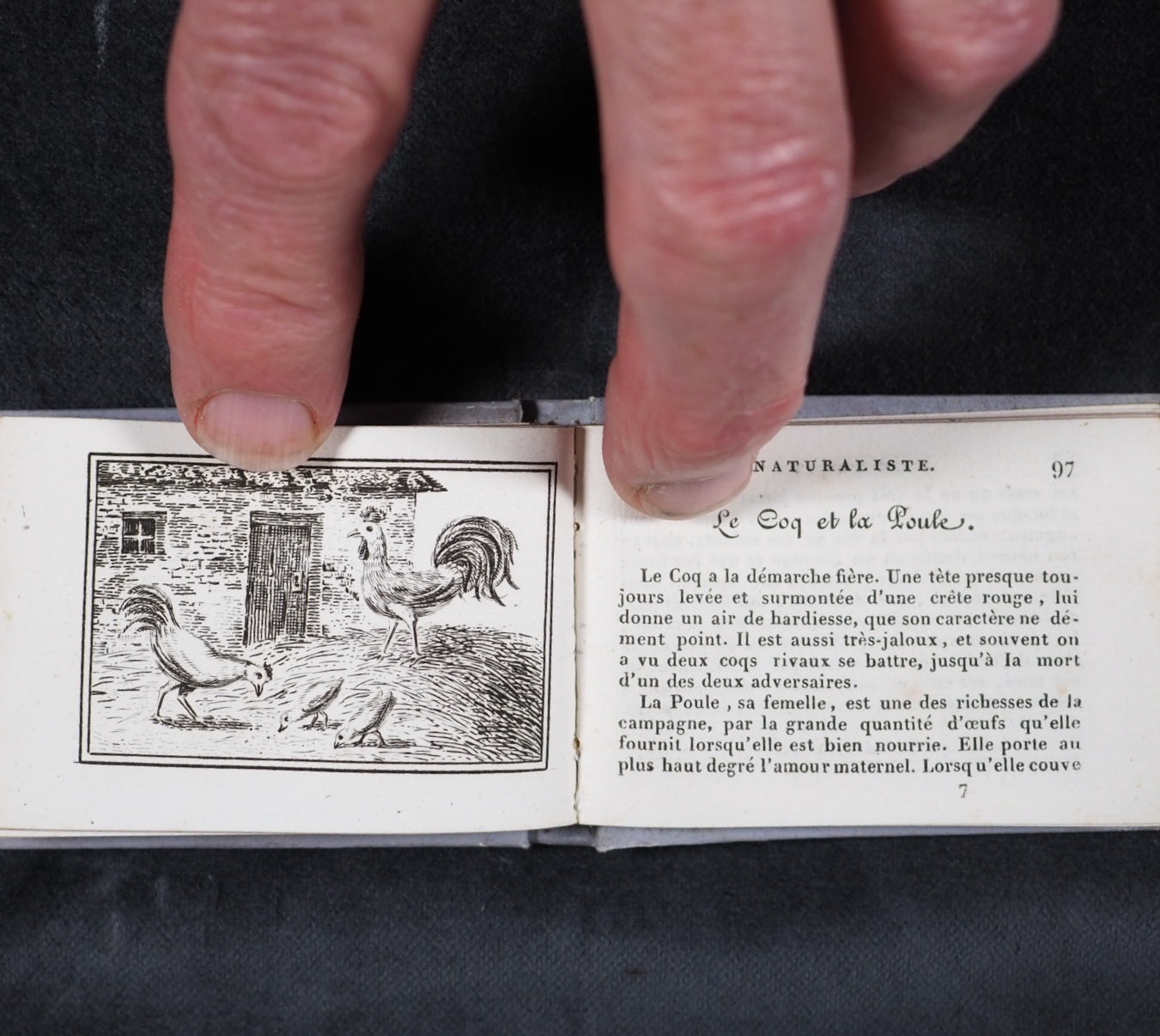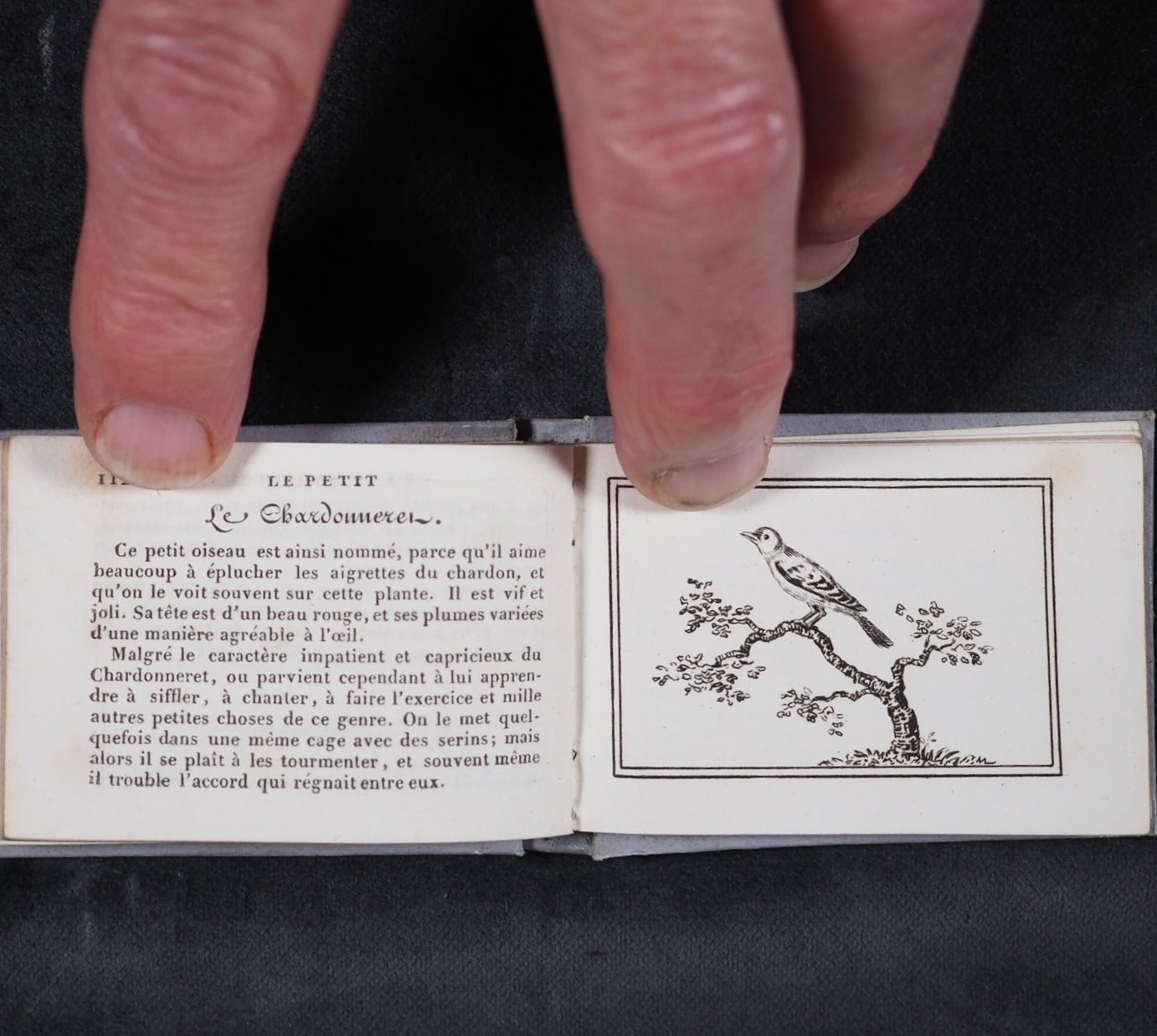 Le Petit Naturaliste. Marcilly. Rue St. Jacques, no. 10. Paris. 1829. No date but 1829. 128 printed pages in French (extremely light spotting). 12 plates. Printed by A. Firmin Didot. All edges gilt. Contemporary ink inscription on front paste-down endpaper. Provenance: Isabella Newcombe. 68 x 50mm. Original purple card; printed in black with 'Le Petit Naturaliste' on spine below anthemion and above foliage motifs; front cover with image of an eagle above the tree-line on a mountain top, within elaborate scrolling border; back cover with two pairs of beavers (very slightly worn down the spine). Complete with original matching printed slipcase; printed with black design of a fox on the front and an elephant on the back; faded, rubbed and a little worn at edges. Gumuchian, 4127. Houghton, 118. Nauroy, 74. Welsh, 5582. Not in Bondy, nor Spielmann. WorldCat locates a total of 6 complete and one imperfect copies, none in the UK. OCLC, 460828770. 116 firsts2024