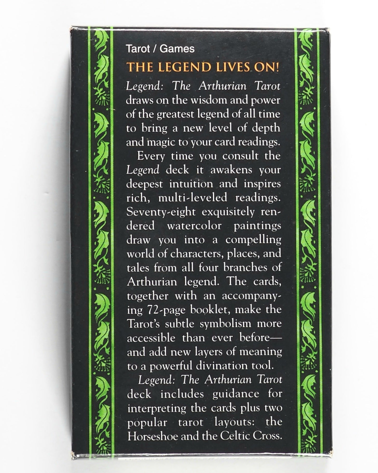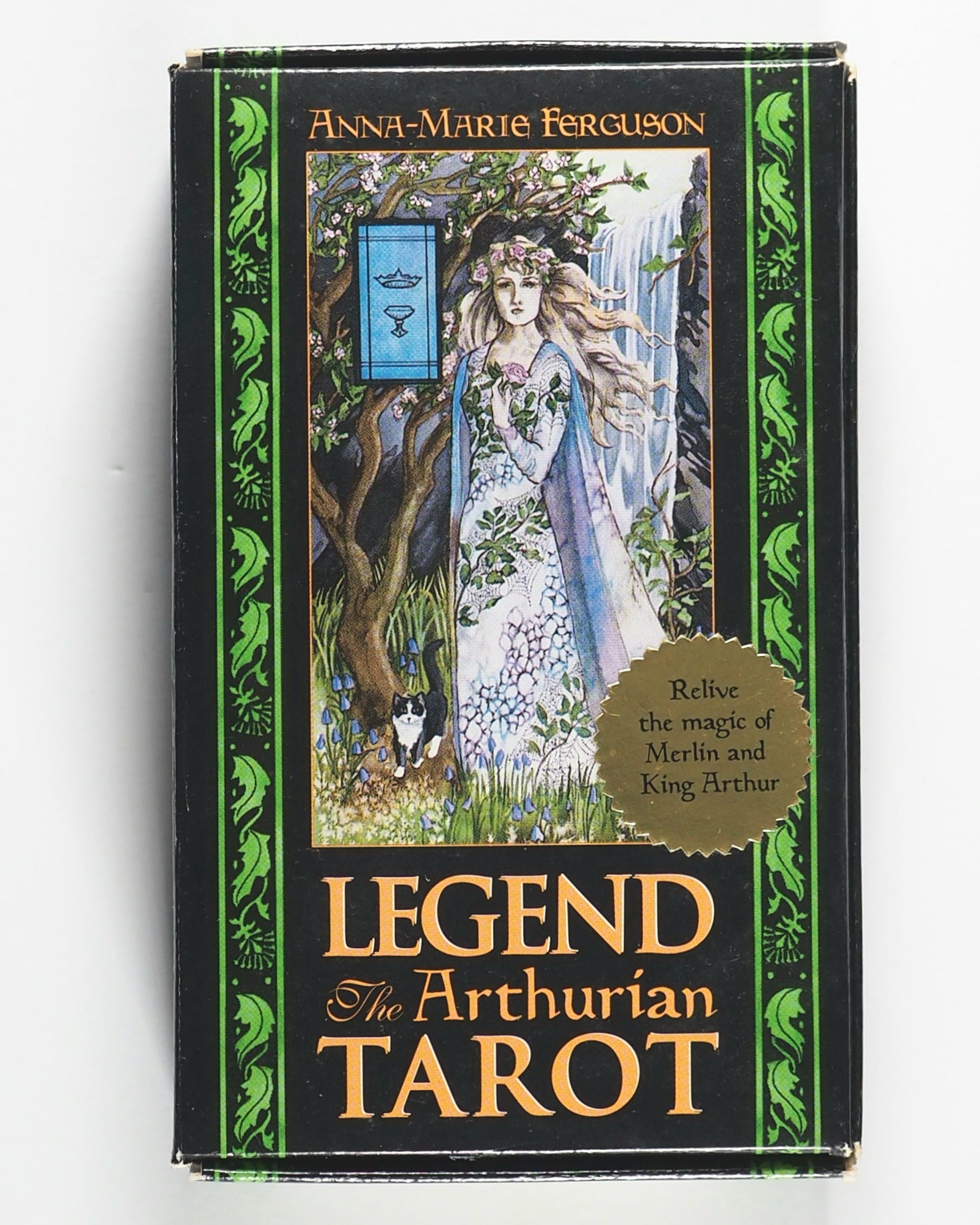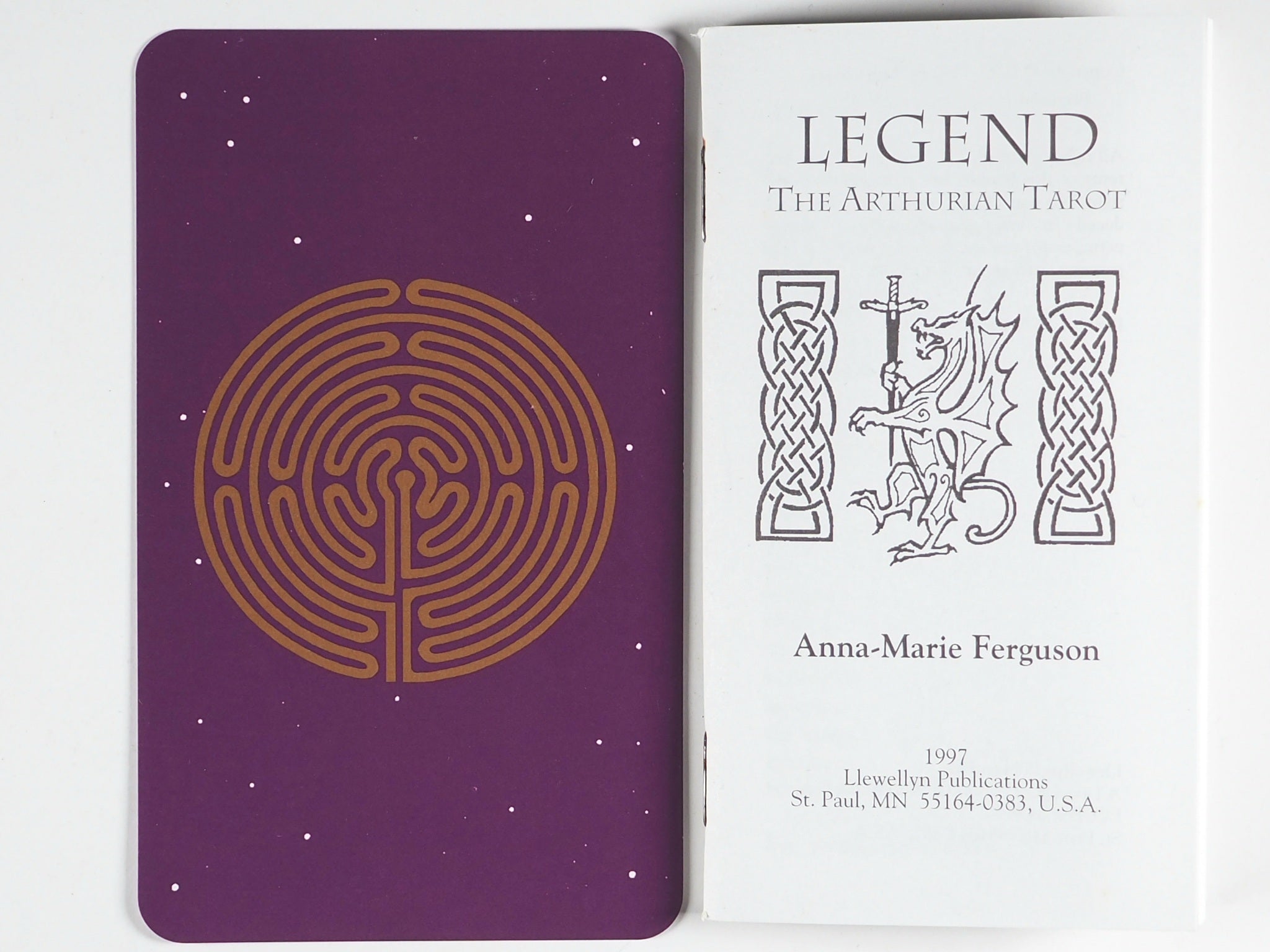 Complete 78 card Legend, the Arthurian Tarot, by Anna-Marie Ferguson. Contains 22 Major Arcana and 56 Minor Arcana cards in the style of traditional heroic figure, Arthur, depicitng the legends, customs, myths, symbols and religion of the Arthurian realm.