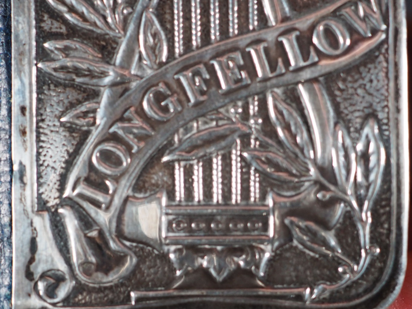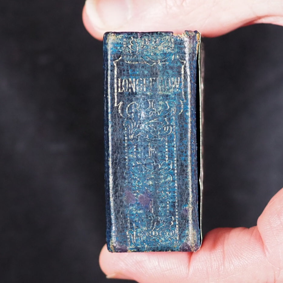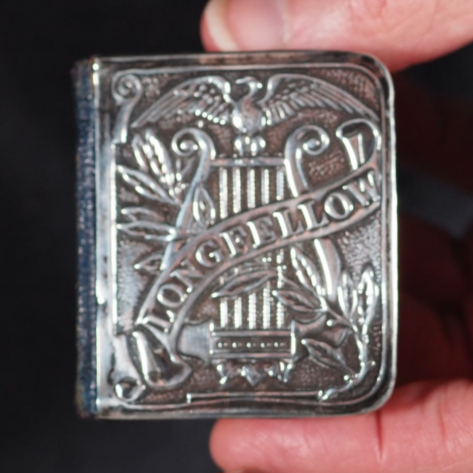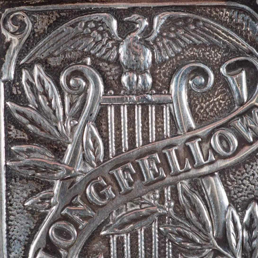 Longfellow, Henry Wadsworth. Poetry of Longfellow, Henry Wadsworth. Eyre & Spottiswoode, Downs Park Road, Hackney N.E. [London]. Circa 1905. xv, 1103 printed pages. All edges gilt over red. Marbled endpapers (inner hinge split but holding firm; A couple of gatherings slightly sprung). Art nouveau spine. Unhallmarked, silver plaque with Longfellow, a lyre and a spread-winged bird with foliage. 48 x 56 mm. Original blue morocco spine with art nouveau gilt titling and design (rather rubbed and worn). Welsh, 4710. Not found in WorldCat. 107 firsts2024