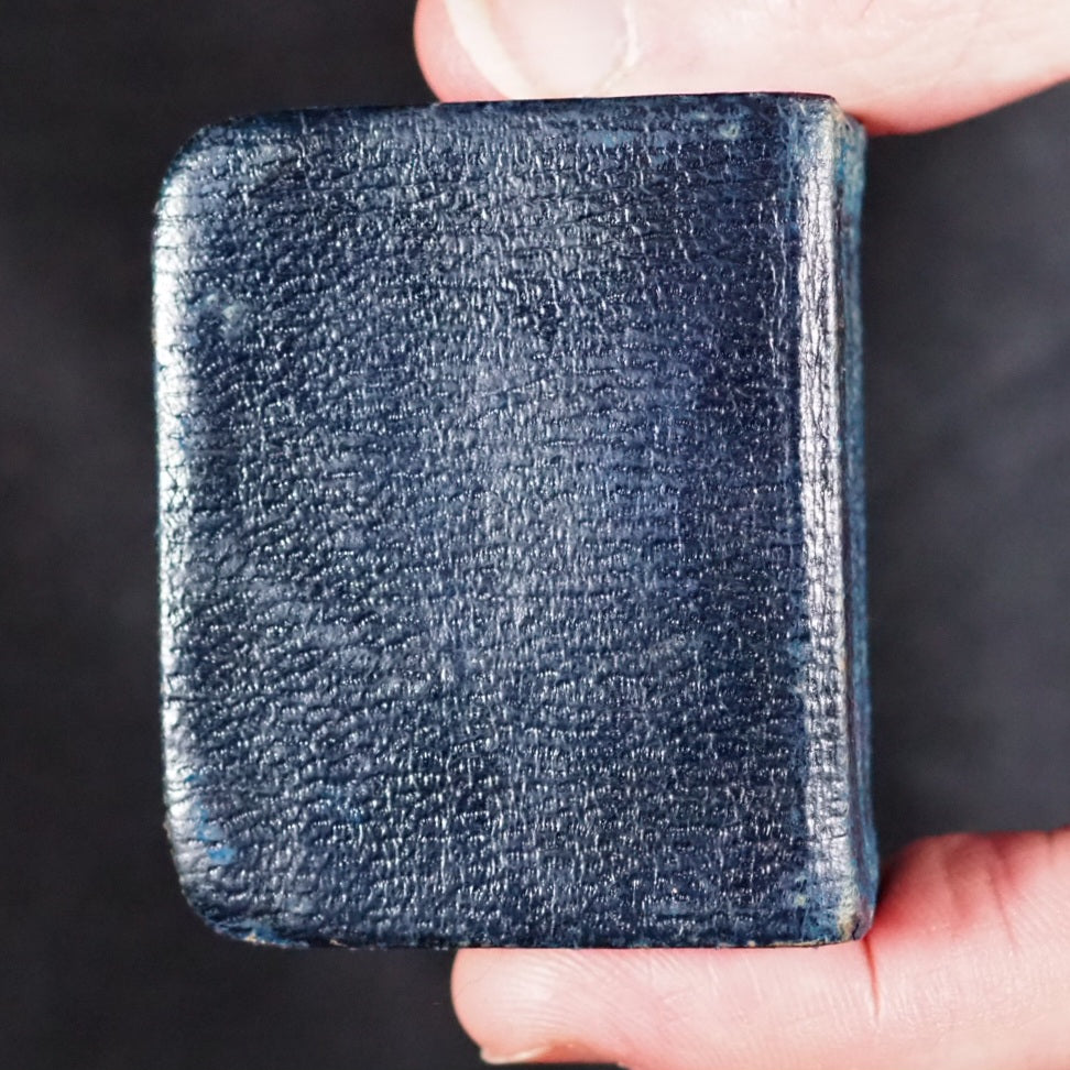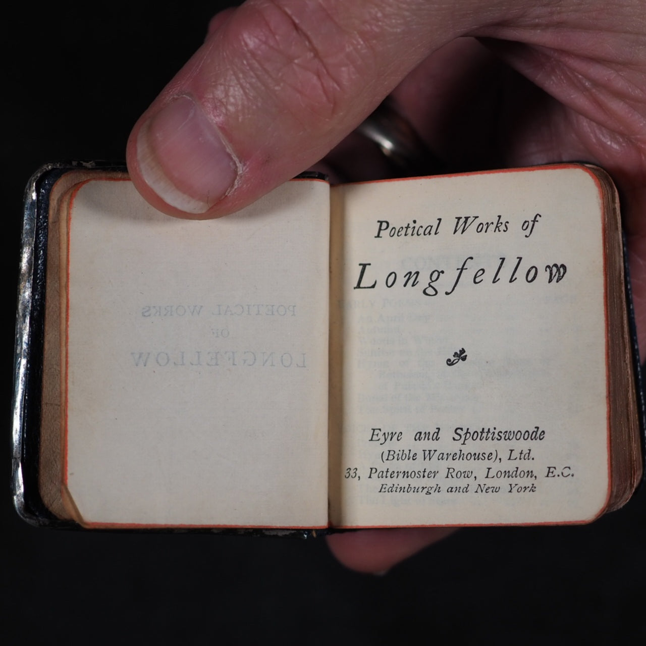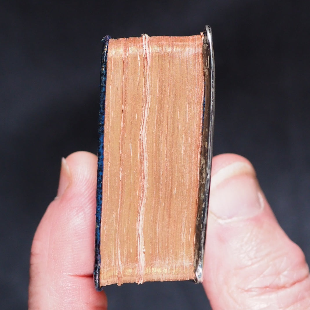 Longfellow, Henry Wadsworth. Poetry of Longfellow, Henry Wadsworth. Eyre & Spottiswoode, Downs Park Road, Hackney N.E. [London]. Circa 1905. xv, 1103 printed pages. All edges gilt over red. Marbled endpapers (inner hinge split but holding firm; A couple of gatherings slightly sprung). Art nouveau spine. Unhallmarked, silver plaque with Longfellow, a lyre and a spread-winged bird with foliage. 48 x 56 mm. Original blue morocco spine with art nouveau gilt titling and design (rather rubbed and worn). Welsh, 4710. Not found in WorldCat. 107 firsts2024