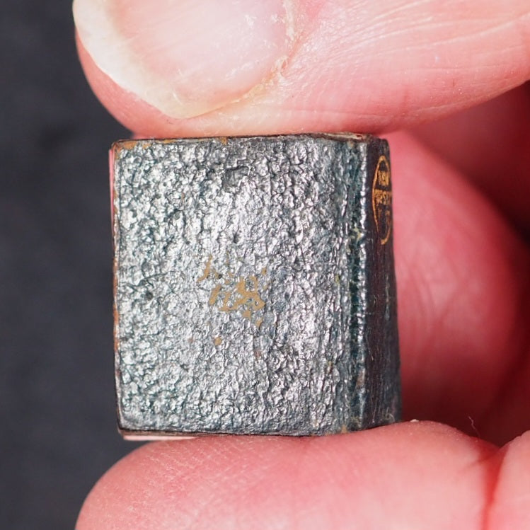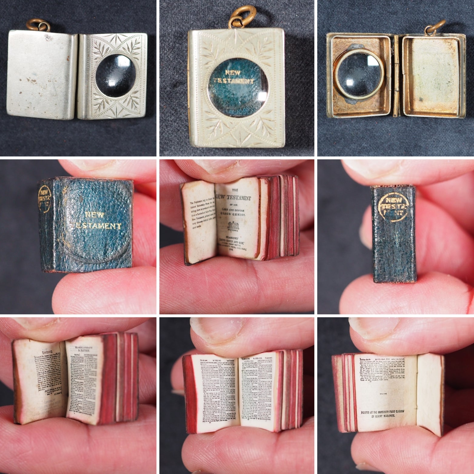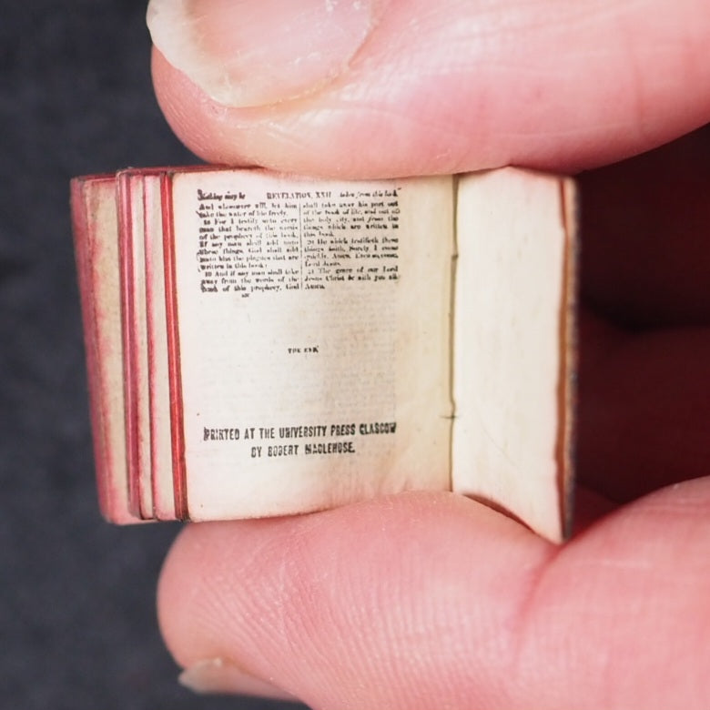 New Testament of the Lord and Saviour Jesus Christ Bryce, David & Son. Glasgow. 1895. 5 unnumbered pages, 4-220 printed pages. Printer's statement:  "The publishers beg to thank the Oxford University Press for enabling them to produce in this tiny form a facsimile of their Pica 16mo New Testament, printed on the very thinnest Oxford India paper ever made" - printed on the verso of half-title. In floral engraved silver-plated solid case with magnifier & with loop. One of the smallest of all Bryce miniature books and the smallest New Testament ever printed. "Staggeringly small"-Bondy. Facsimile of Oxford Pica 16mo and printed on the "very thinnest Oxford Paper ever made". 16 x 18 mm. Original blue morocco (somewhat rubbed from insertion into and removal from the case).  Also issued by publisher as one of a twelve-volume set in a metal shelved glass case with the heading "Midget Library," accompanied by miniature magnifying glass; case then fits into an angled wooden stand. Bondy, 111. Pistner, B233:2. Spielmann, 388. Welsh, 787. OCLC, 256915722. WorldCat locates 5 copies worldwide.  33 firsts2024