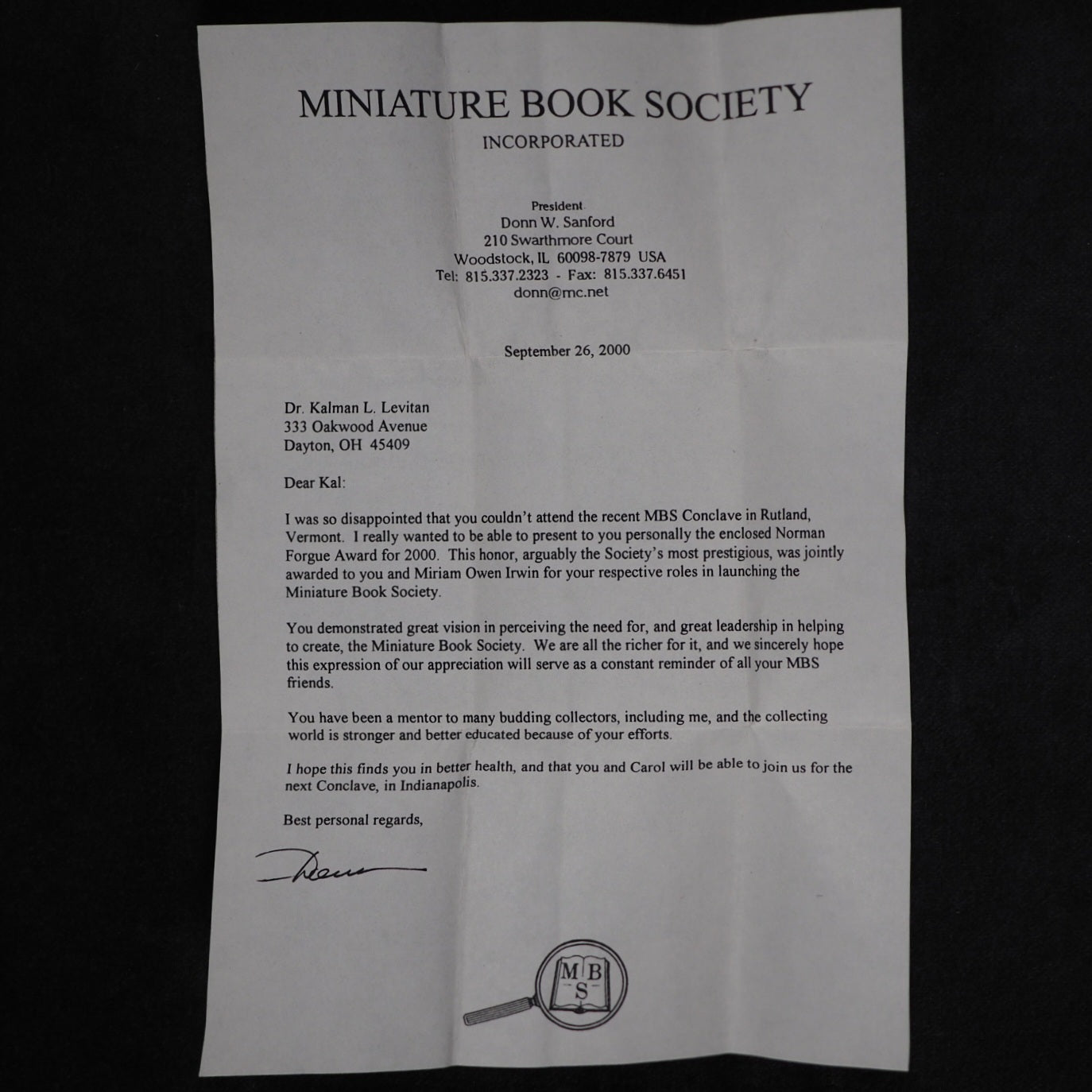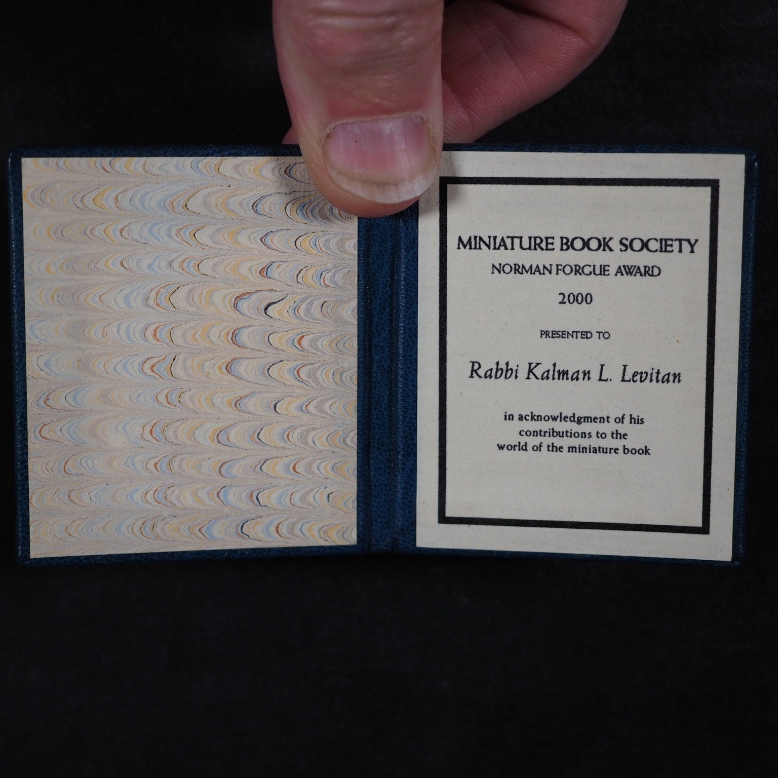 Norman Forgue Award. Sanford, Donn W. Miniature Book Society. 2000. Presented to Kalman L. Levitan [and to Miriam Owen Irwin]. Complete with signed printed letter of award that reads "Dear Kal: I was so disappointed that you couldn't attend the recent MBS Conclave in Rutland, Vermont. I really wanted to be able to present to you personally the enclosed Norman Forgue Award for 2000. This honour, arguably the Society's most prestigious, was jointly awarded to you and Miriam Owen Irwin for your respectiveroles in launching theMiniature Book Society. You demonstrated great vision in erceiving the need for, and great leadership in helping to create, the Miniature Book Society. We are all the richer for it, and we sincerelyhope this expression of our appreciationwill serve as a constant reminder of all your MBS friends. You have been a mentor to many budding collectors, including me, and the collecting world is stronger and better educated because of your efforts....". Marbled paste-down endpaper. 5.5 x 6.5 mm. Original blue crushed niger morocco. Levitan spent 30 years active duty in the U.S. Navy and U.S. Air Force, retiring with the rank of Colonel. He was a member of the Department of Defense Armed Forces Chaplains Board and served nine years as Senior Jewish Chaplain as advisor on Jewish activities to the Chief of Air Force Chaplains. He was Founder and first Chairman of the Miniature Book Society of America. He was an active teacher of Judaism. He received his BA from Yeshiva University, Master of Hebrew Letters from the Jewish Institute of Religion and Doctor of Divinity from Hebrew Union College. He did graduate study at Harvard Law School and Columbia University. In addition he published his own miniature books and wrote and edited volumes about miniature books. In 1983 he was instrumental in bringing together the collectors and publishers from around the United States that eventually formed the basis for the Miniature Book Society. Elected the Society’s first “Chairman” he helped draft bylaws and began an informal newletters. As a child, Rabbi Levitan’s father gave him a pocket-sized Hebrew prayer book printed in Warsaw in 1903. That was the beginning of a 2,000 volume collection that David Bromer (Bromer Booksellers, Boston) said was considered one of the most important collections. It spanned five centuries and included many rare and precious volumes. Levitan died less than two years after receiving this award. 179 firsts2024