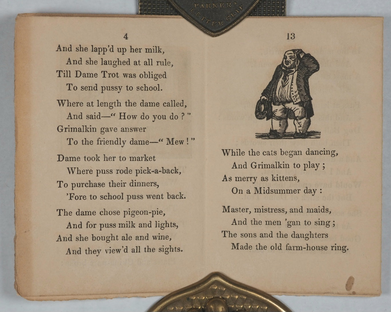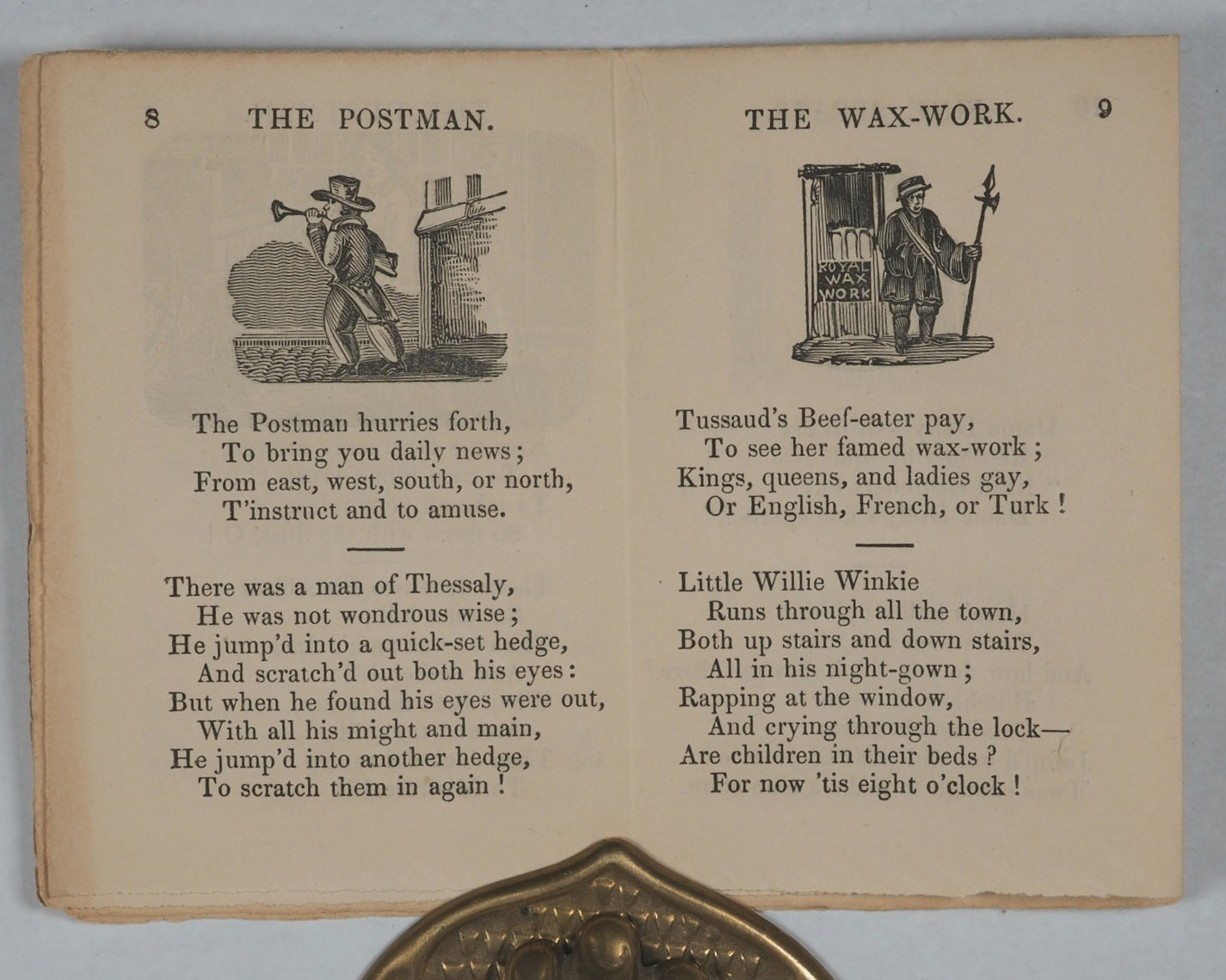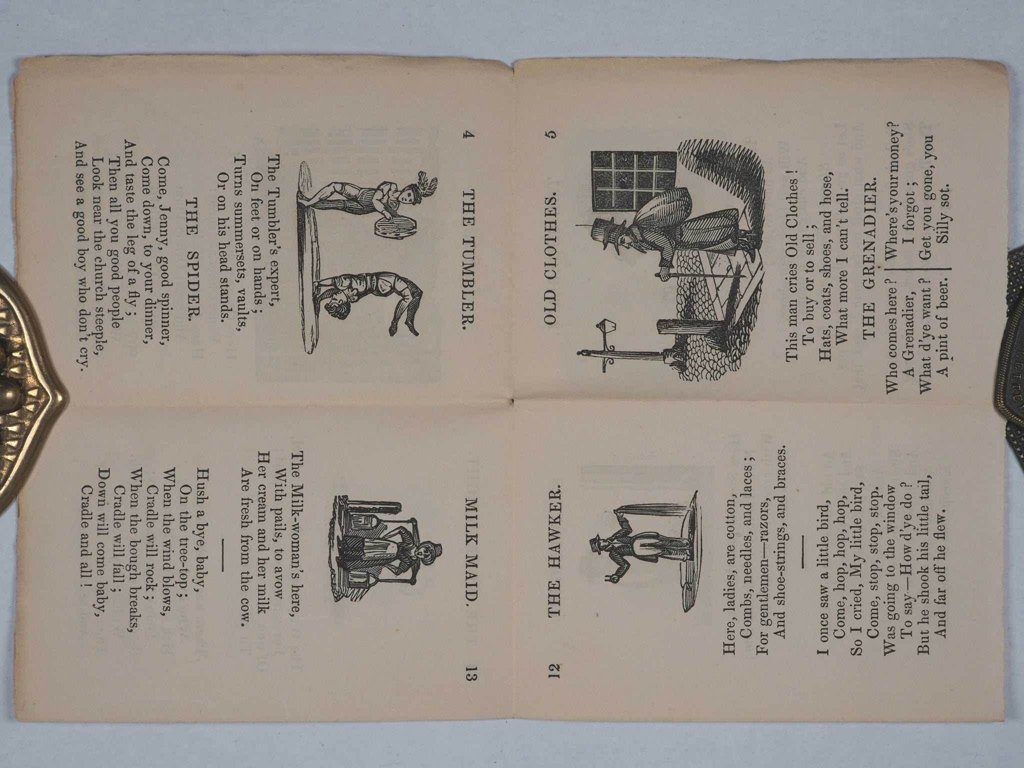 Four individual chapbooks by the same publisher. First sentence of Nursery Rhymes: "Now shall my pretty Albert ride, And Henry too shall go astride; The little dog shall run one side, And puss shall go on t'other: And Adelaide shall have a walk, And baby too, o'er hill of chalk, And guile the road in pleasant talk, To see their kind grandmother." Includes 16, 11, 16, and 11 woodcuts respectively for each chapbook.