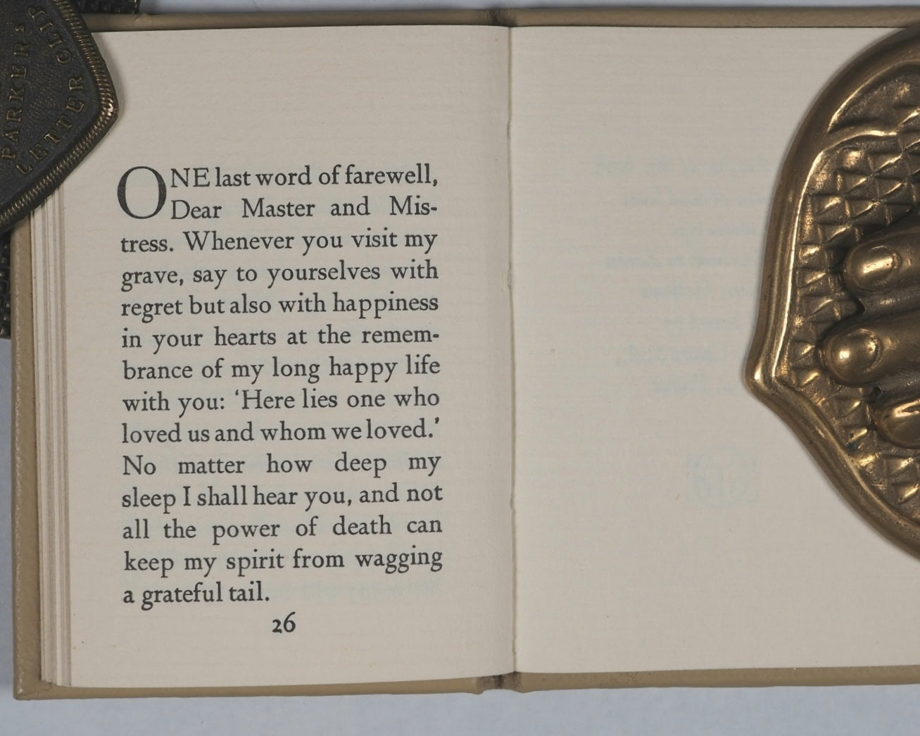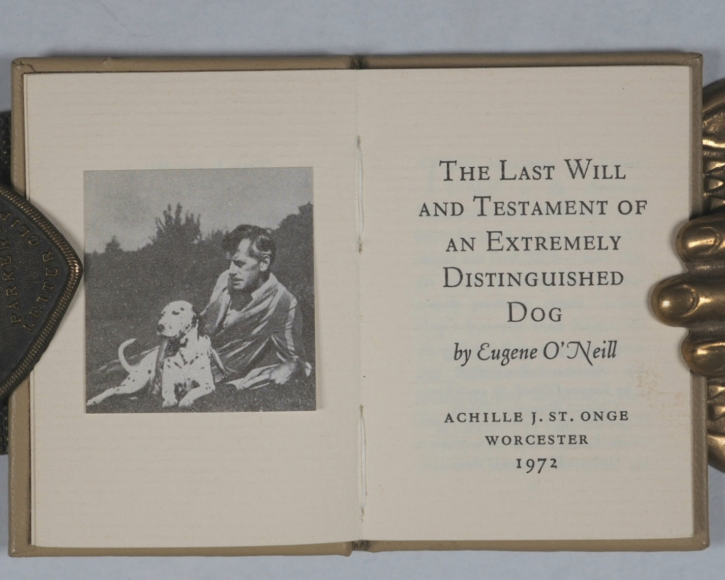 It is an emotional, firsthand account written by the famed playwright when his beloved dog, Silverdene Emblem O'Neill ("Blemie"), was dying. The piece highlights themes of unconditional love, the wisdom of animals in accepting death, and the enduring bond between humans and their pets. The 1972 publication by Achille J. St. Onge in Worcester is notable as a specialized miniature edition of this enduring, heartfelt, and sentimental, yet poignant piece of literature. It is written from the dog's perspective, famously stating, "No matter how deep my sleep I shall hear you and not all the power of death can keep my spirit from wagging a grateful tail". Known for being a "balm" or comfort for those experiencing the loss of a pet. The work is considered a rare, intimate look at the tender side of a man best known for his despairing and pessimistic, albeit genius, theatrical works.