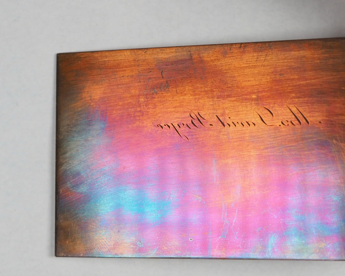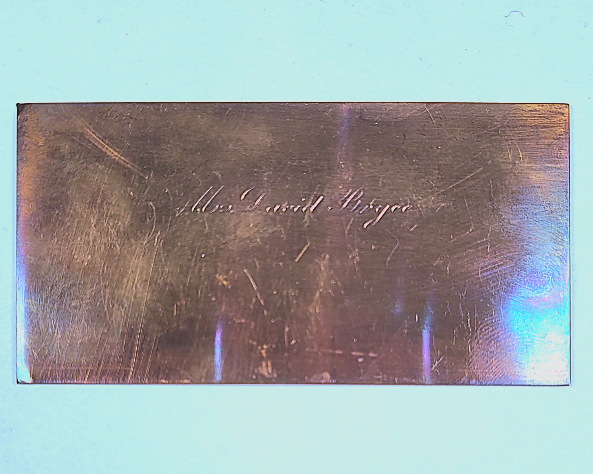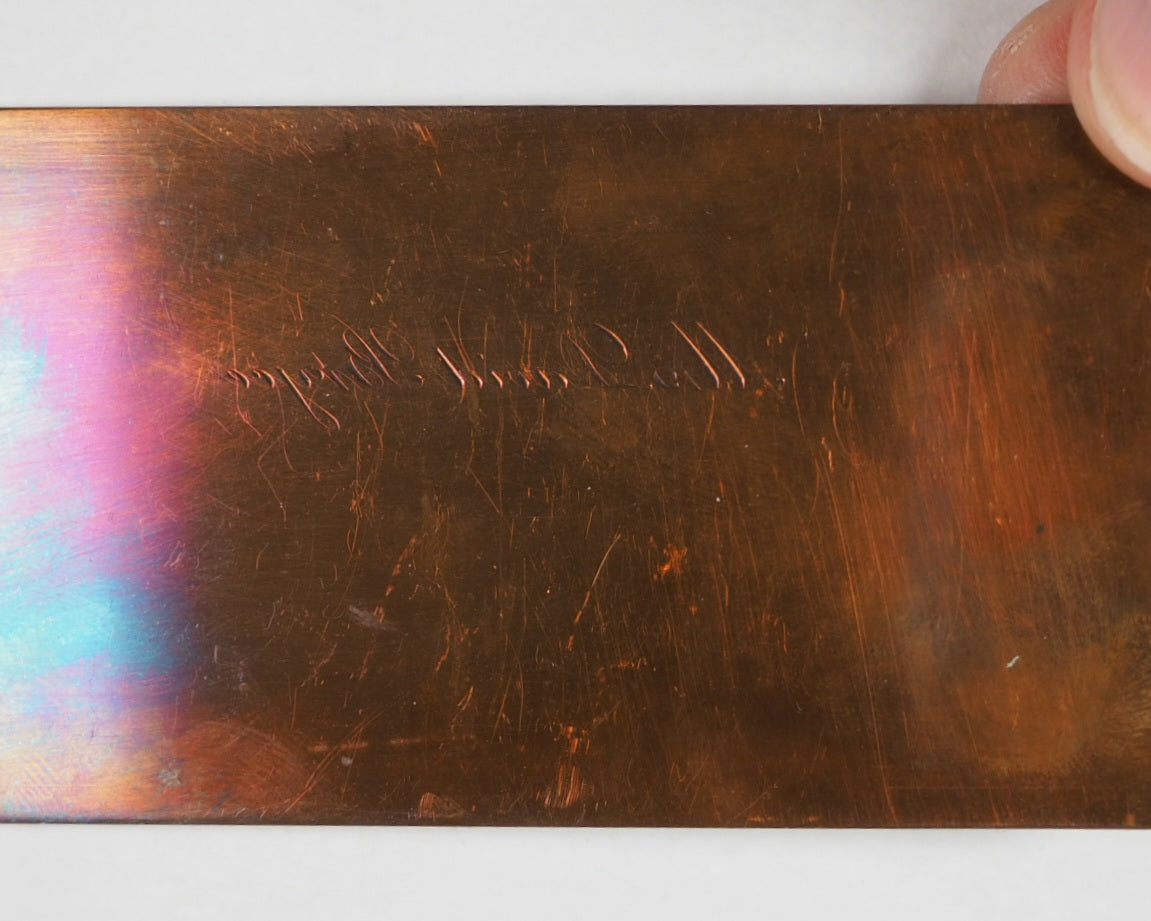 Hand etched in flowing gothic script, "Mr. David Bryce" in reverse. Original printing plate in copper. 96 x 50 mm. The lettering is 45 x 9 mm. Unique David Bryce artefact. Originally produced for the owner of David Bryce and Son, Glasgow publishers of over a million miniature books until the company closed down in 1915. It is possible that this was used at some point in one of the production processes at the Glasgow publishing house but much more likely it was created for personal use. Whatever it's specific intended uses were, it has survived remarkably and now continues to clearly show the results of drawing Bryce's name through the original copper ground with an etching needle. It provides a rare physical link to the man who, as he himself described it, "descended to the miniature" to create the world's smallest Bibles and dictionaries. This item has impeccable documented provenance as having belonged to David Bryce: it was carefully and lovingly handed down within the direct family of David Bryce until finally disposed of in 2025 by the great-niece of David Bryce's grandaughter.