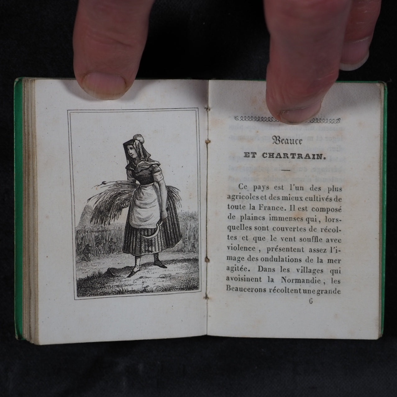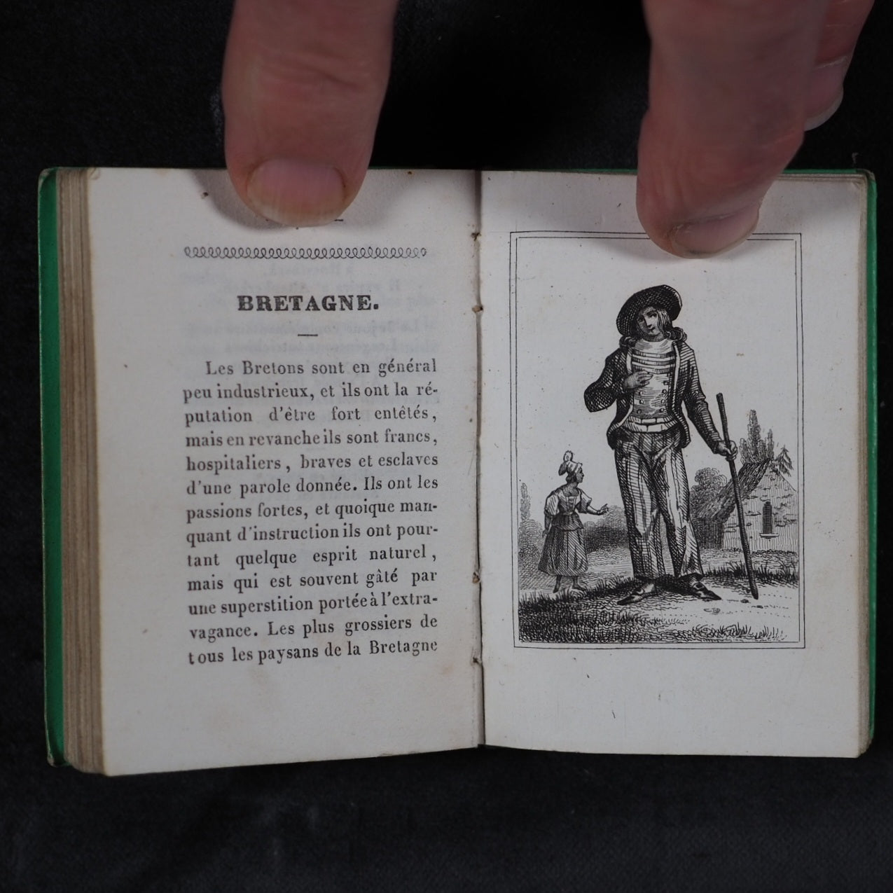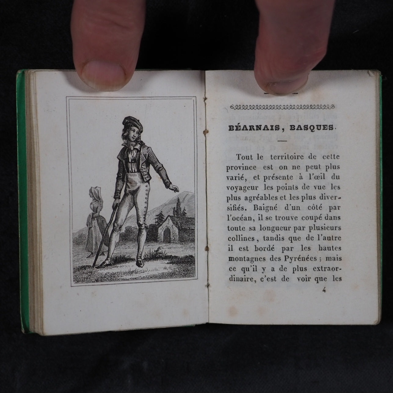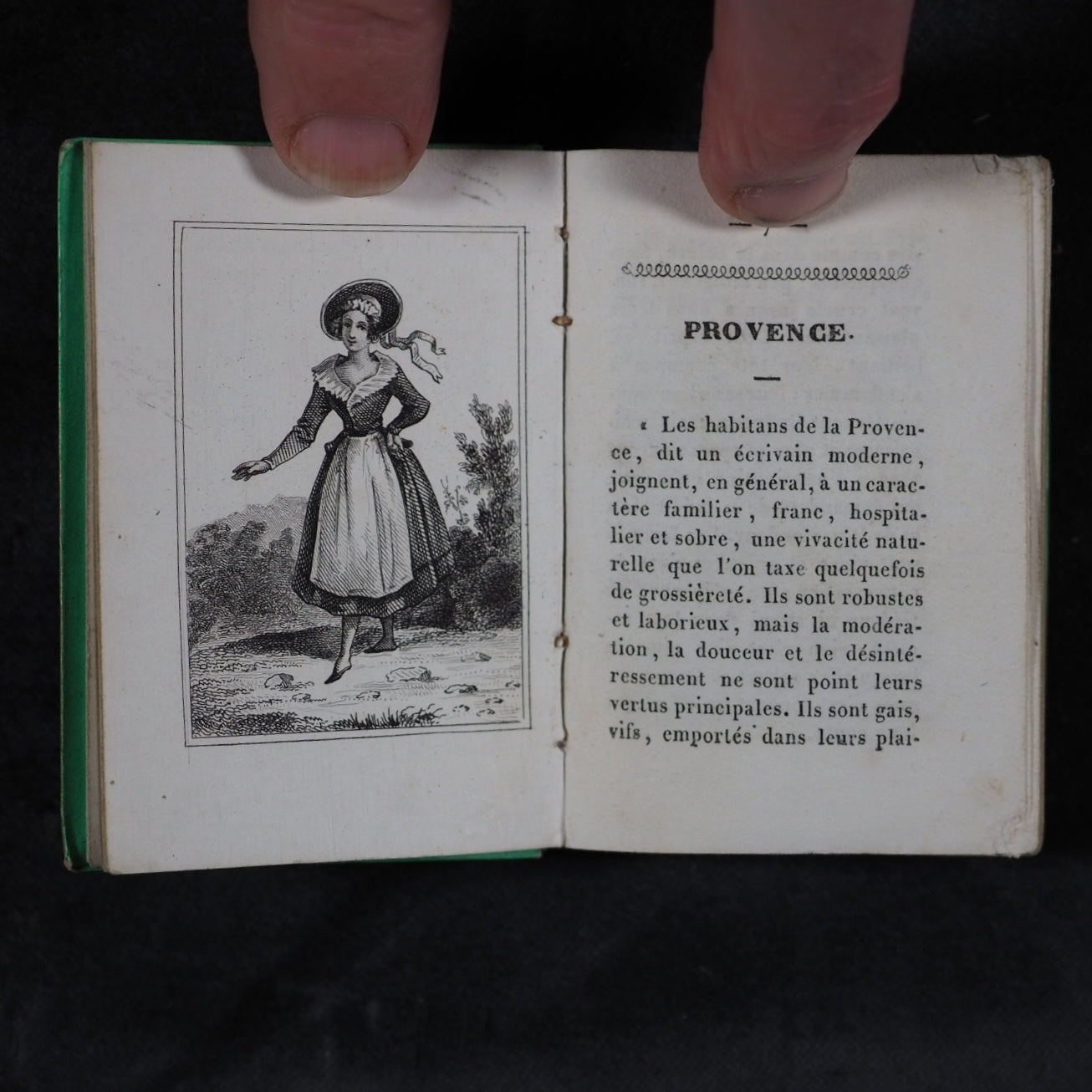 Petite Excursion en France. Marcilly. Rue St. Jacques, 10. Paris. 1836. Undated (but 1836). 128 printed pages in French (extremely light spotting). Engraved title page and 11 provincial costume plates. Printed by A.Pinard, Quai Voltaire, 15 [Paris]. In the series 'Petite bibliothèque de la jeunesse'. All edges gilt. 54x 78 mm. Original 'Rome' lime green embossed cartonnage binding covered in papier porcelaine. Slightly rubbed and corners bumped; spine slightly faded. Nauroy, 76. Welsh, 5633. OCLC, 44027154. WorldCat locates 6 copies worldwide. 163 firsts2024