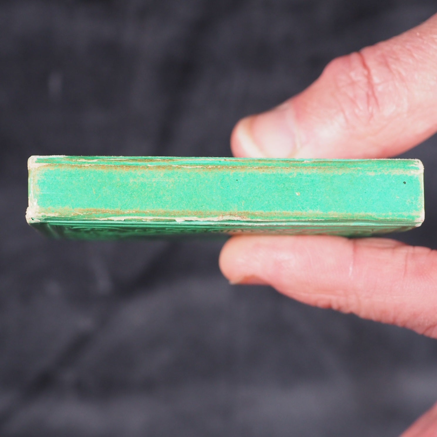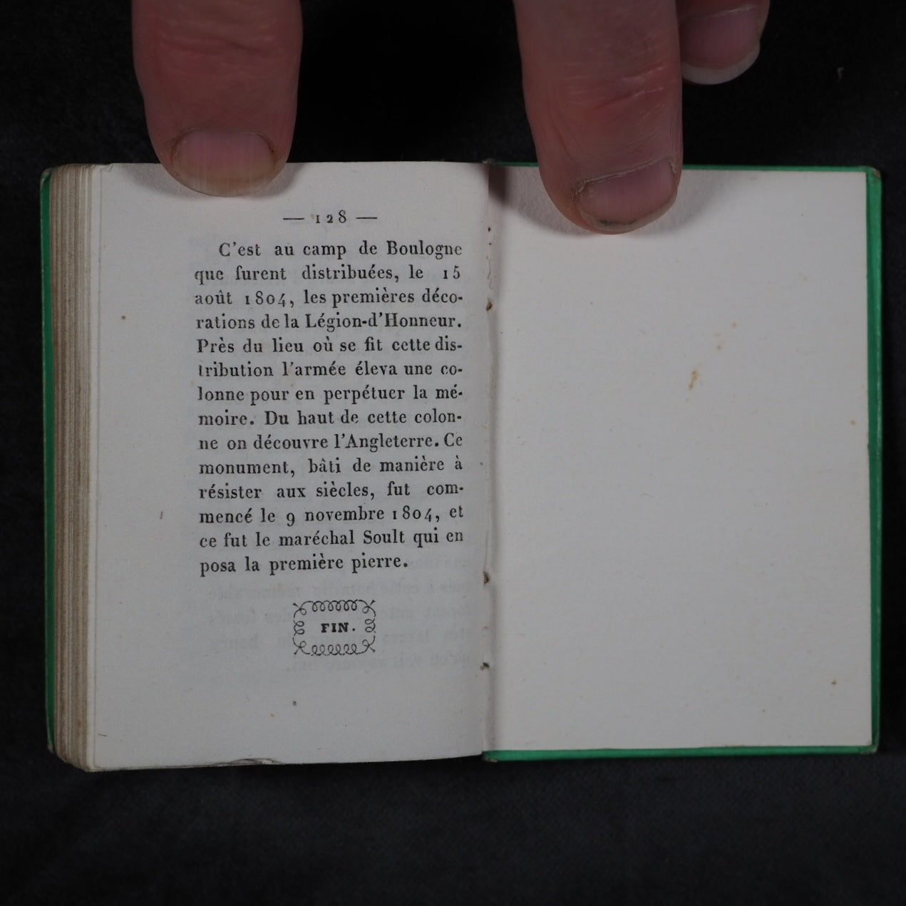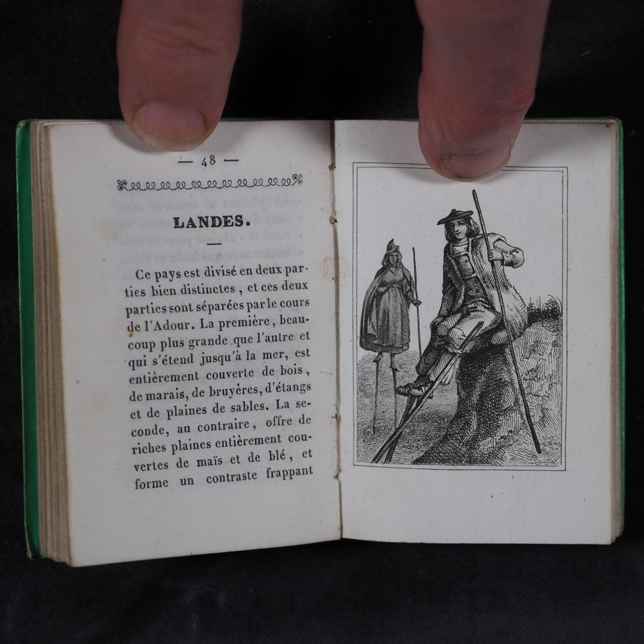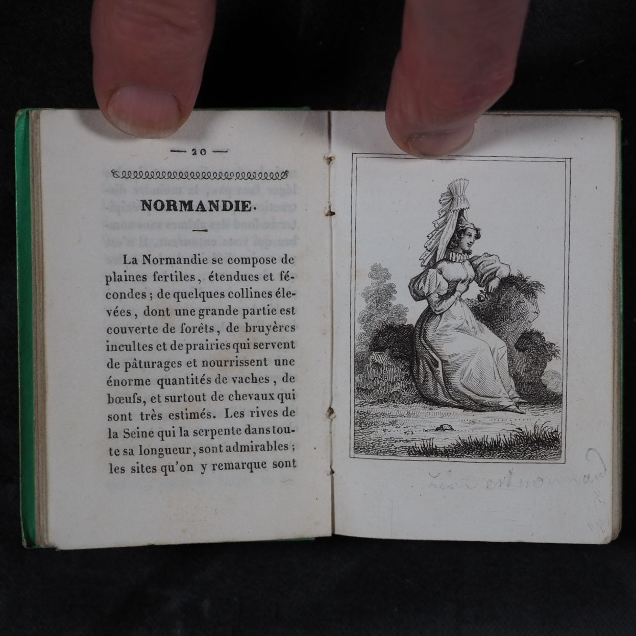 Petite Excursion en France. Marcilly. Rue St. Jacques, 10. Paris. 1836. Undated (but 1836). 128 printed pages in French (extremely light spotting). Engraved title page and 11 provincial costume plates. Printed by A.Pinard, Quai Voltaire, 15 [Paris]. In the series 'Petite bibliothèque de la jeunesse'. All edges gilt. 54x 78 mm. Original 'Rome' lime green embossed cartonnage binding covered in papier porcelaine. Slightly rubbed and corners bumped; spine slightly faded. Nauroy, 76. Welsh, 5633. OCLC, 44027154. WorldCat locates 6 copies worldwide. 163 firsts2024