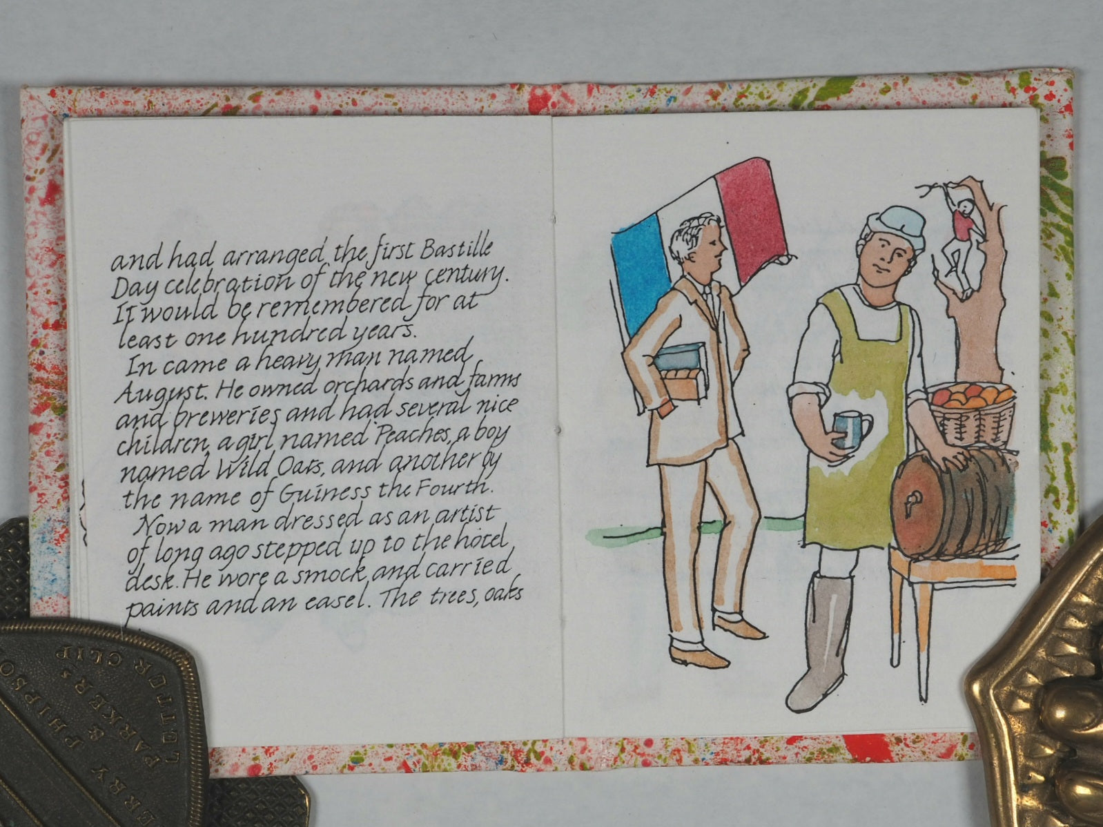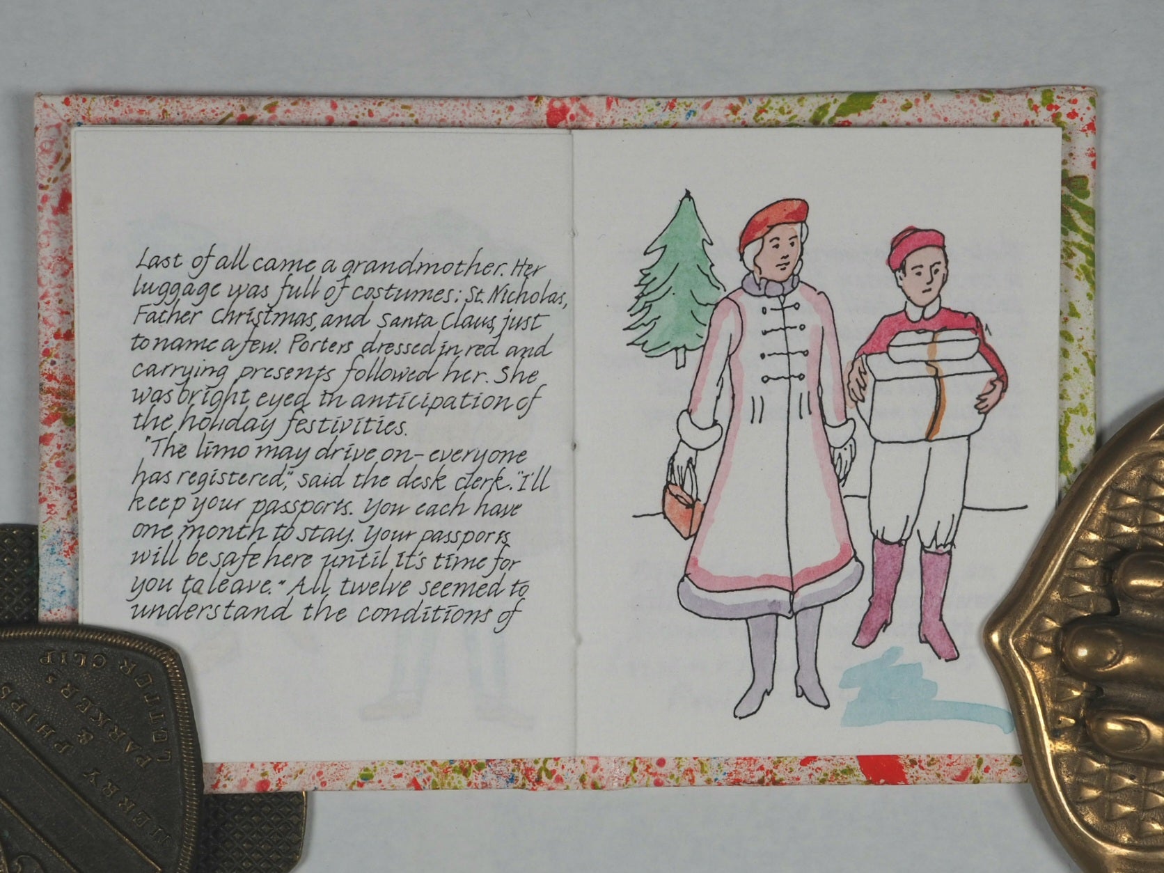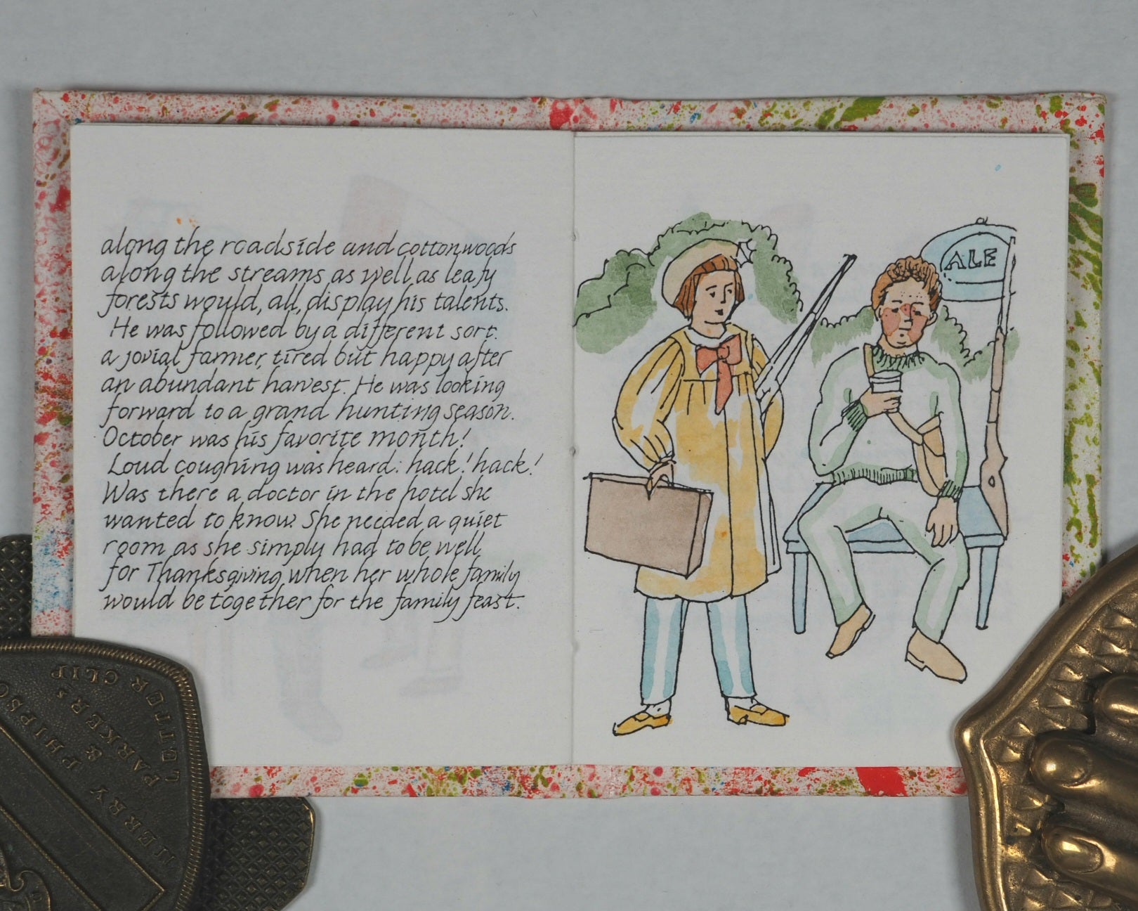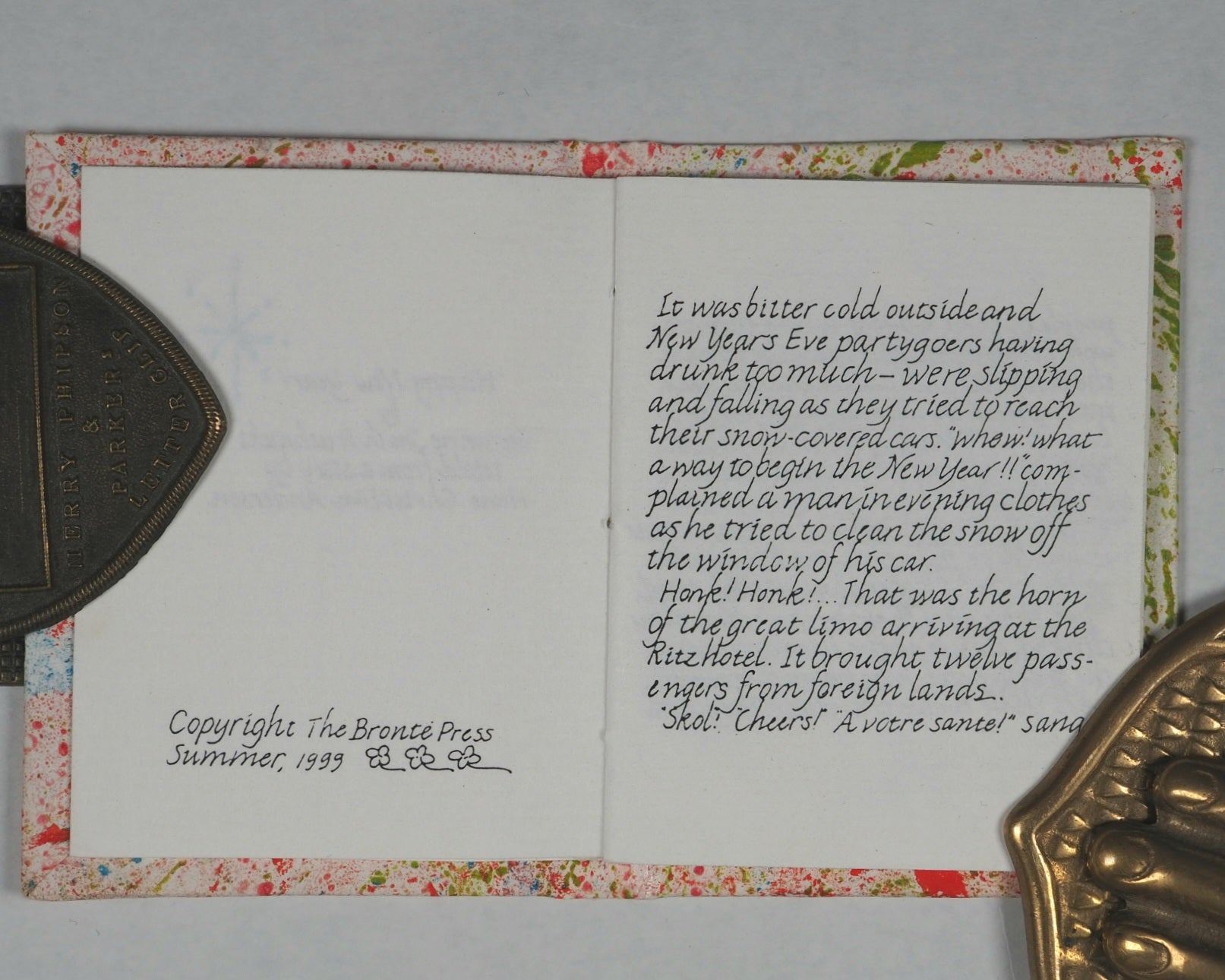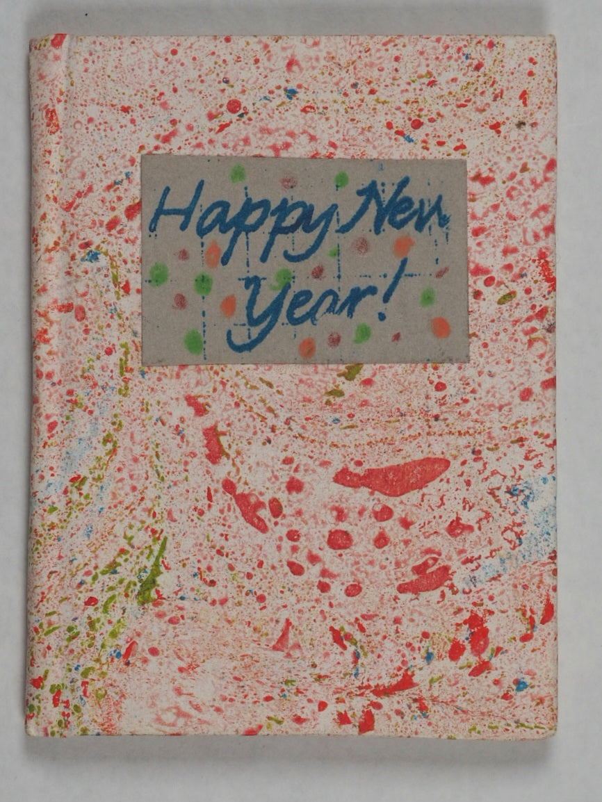 "Printed ... in an edition of 60 copies. Hand coloured by Suzanne + Paul Pruchnicki. No. 51"--Colophon. Paper label on front cover. OCLC, 77740844. Worldcat records just three copies worldwide (Delaware, Virginia, and Wyoming university Libraries). It is an adaptation of a Hans Christian Andersen tale, specially produced in the summer of 1999 to coincide with the changing of the millennium. It is bound in marbled paper over boards with a hand-decorated title label representing a high level of artisanal bookbinding. Suzanne Granzow Pruchnicki and Elmira Smith Wilkey operated Bronte Press out of Manteno, IL (often associated with the Bourbonnais area), specializing in miniature books since 1977. Bronte Press books are often produced in limited runs, often hand-signed and numbered, making them sought after by collectors. Happy New Year! is a fine example of the meticulous work produced by Pruchnicki and Bronte Press, blending literary history with specialized, small-format book arts.