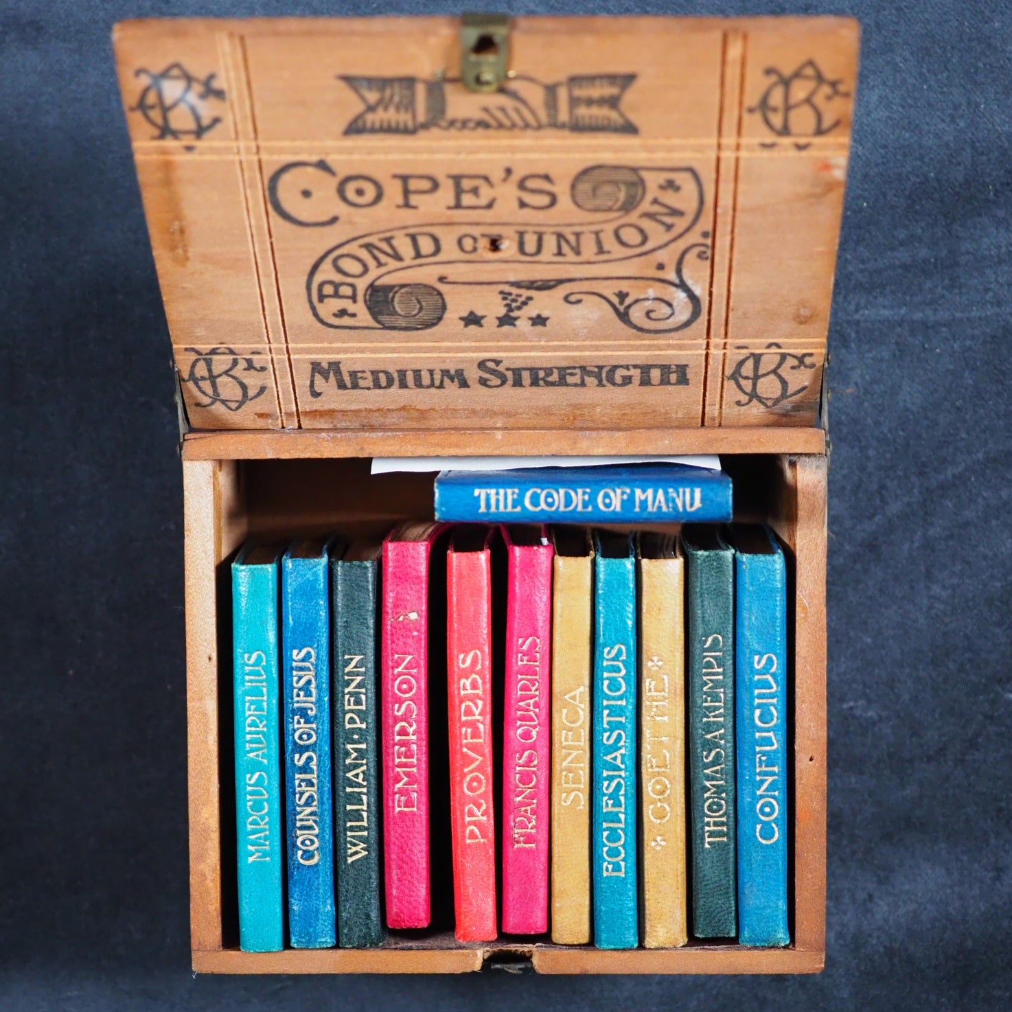 Quarles, Francis. Words of Wisdom. Selections from the Writings of Francis Quarles. Hills & Co. Ye St. Luke's Press. London. 1910 Circa 1910. (60) printed pages. Original marbled endpapers. All edges gilt. 53 x 70 mm. Bound in ruby calf with gilt lettering down the spine; panelled covers with blind stamped bay tree on back and celtic knot motif below titling on front cover. Not in Bondy, nor Spielmann, nor Welsh. OCLC, 960458095. WorldCat locates1 copy worldwide (Pierpont Morgan Library). 119 firsts2024