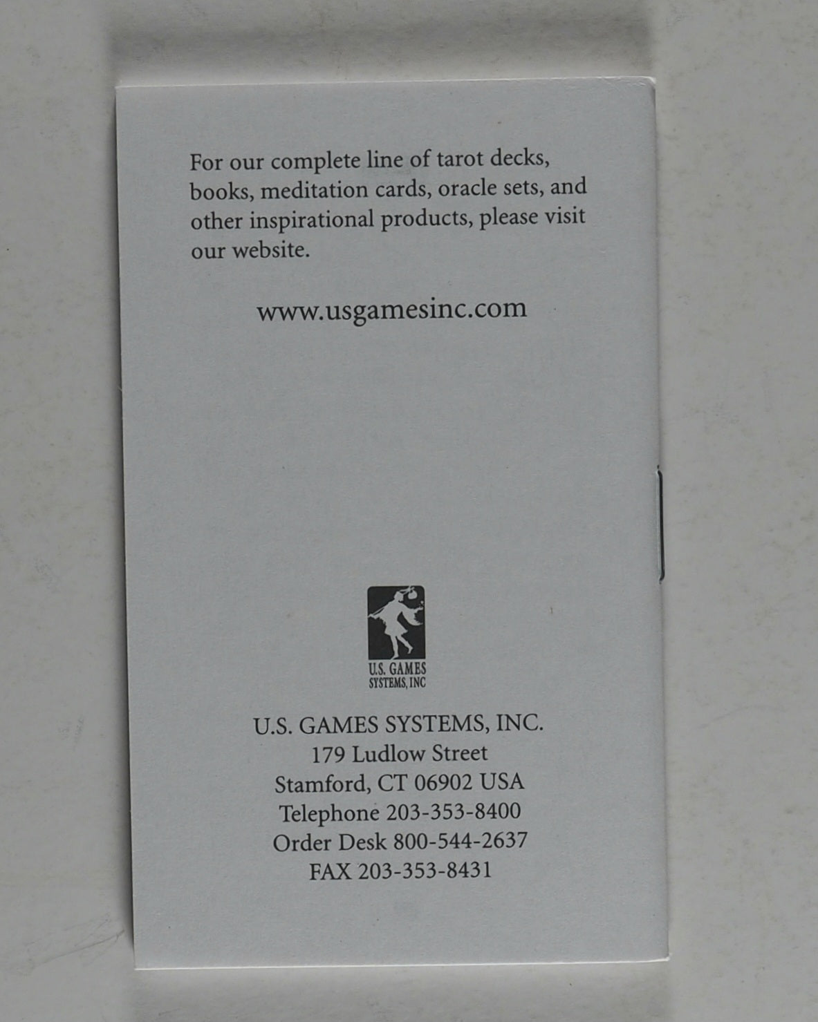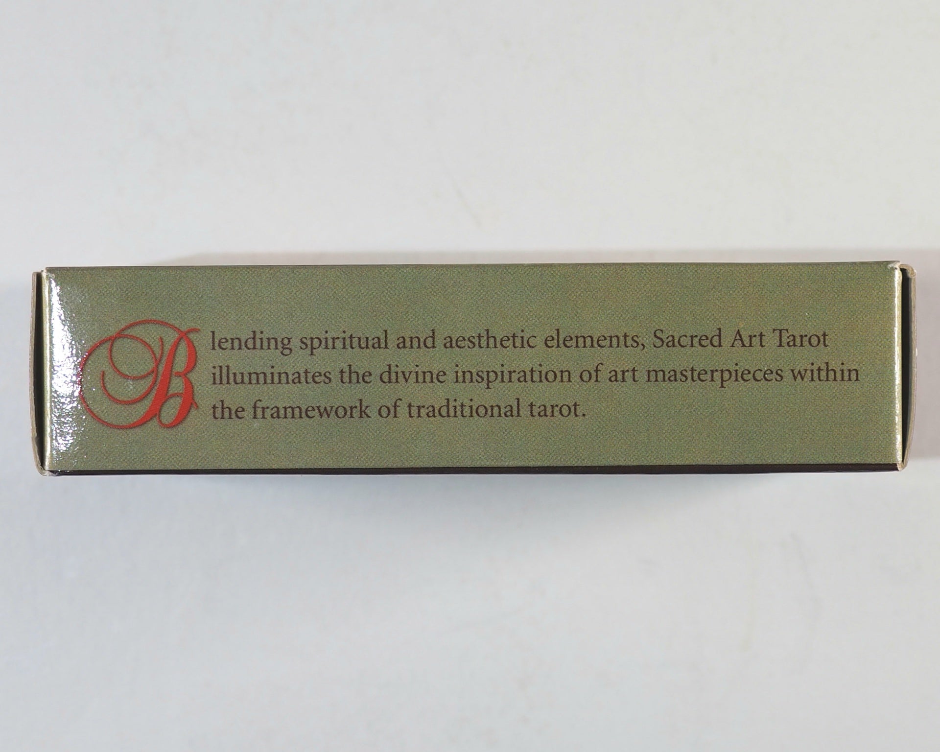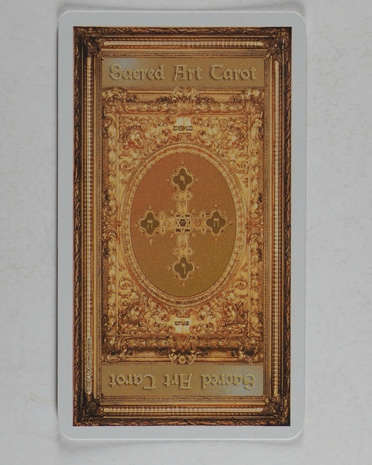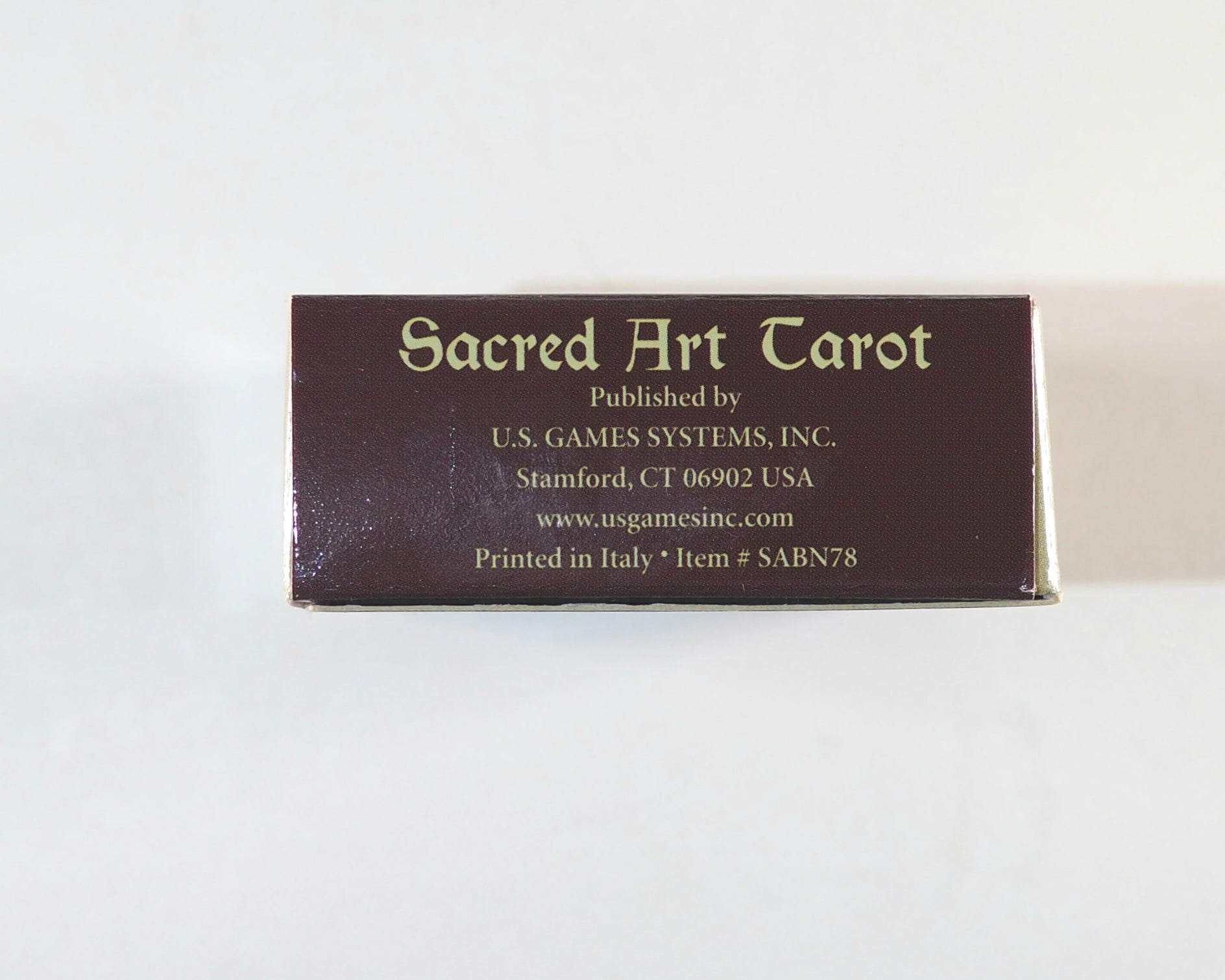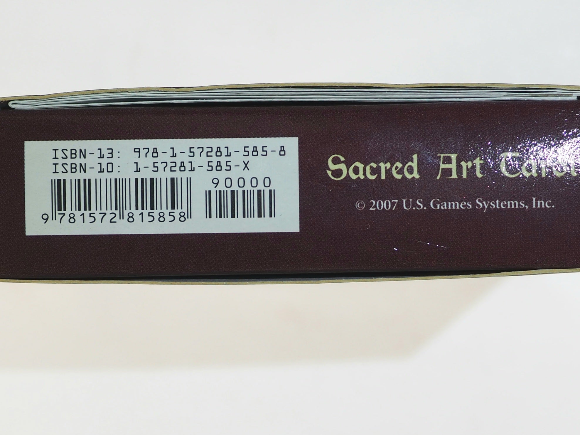 Complete 22 Major Arcana cards and 56 Minor Arcana cards. 78 fully coloured cards with rounded corners and '2007 US GamesSystems' on back lower left hand side of each one. Back Design: Decorative gold deck with the words Sacred Art Tarot on the top and bottom.