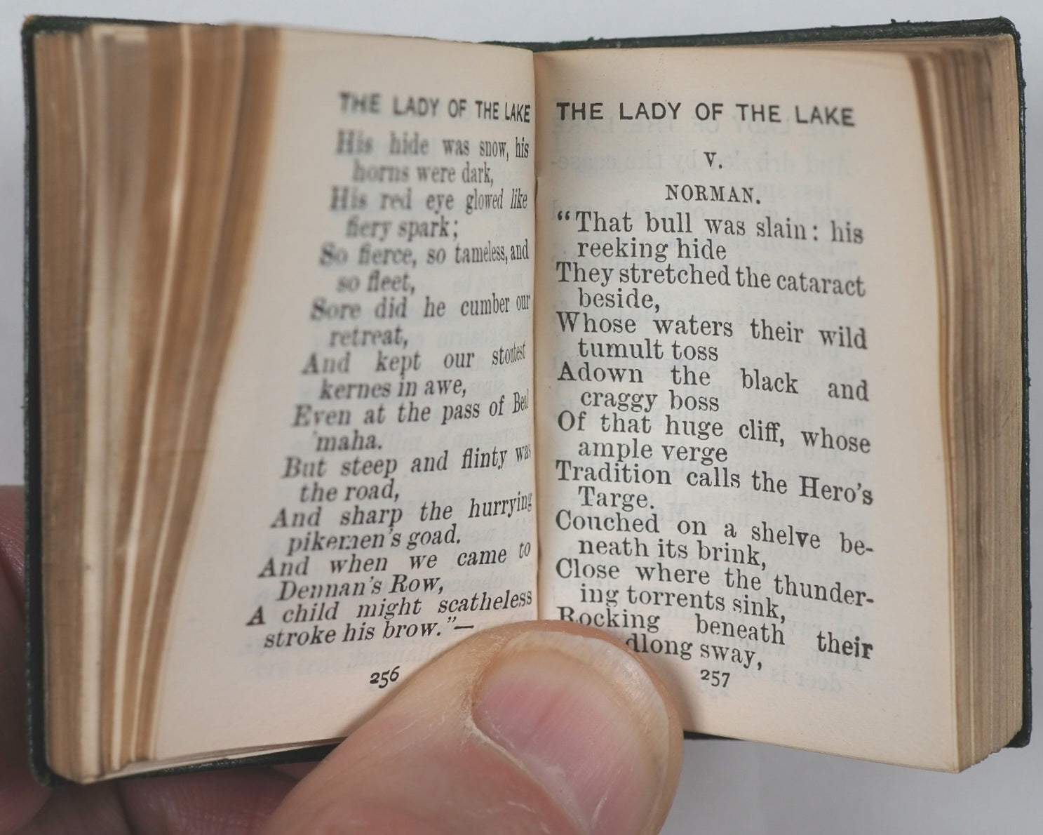 [2, blank], half-title, frontispiece, title-page, colophon ('Printed at University press, Glasgow. MCMV. '), 7-507 numbered pages, [1], + 2 pages publisher's adverts at end (for Tennyson's 'Poems' and Burns' 'Cottars Saturday night' in similar Demi 128mo formats). Fine India paper. Ellen Terry Miniature Library. Top edges gilt. Original blue endpapers. No inscriptions. 35 x 50 mm. Original green lambskin; gilt thistle decoration and titling on spine; gilt titling and image of female on a small boat on front cover. Bondy,116. See Welsh, 6196 for Bryce and New York Frederick Stokes Co. edition. See OCLC, 291099305 for Bryce/Stokes edition. WorldCat locates 10 copies worldwide of the Bryce/Stokes edition but no copies of this Bryce/Frowde imprint. Sir Walter Scott's The Lady of the Lake (1810) was a massive cultural phenomenon, popularizing the Scottish Highlands, especially Loch Katrine and the Trossachs, creating a tourism boom, blending historical figures such as King James V with romance, and establishing Scott as a literary giant.
