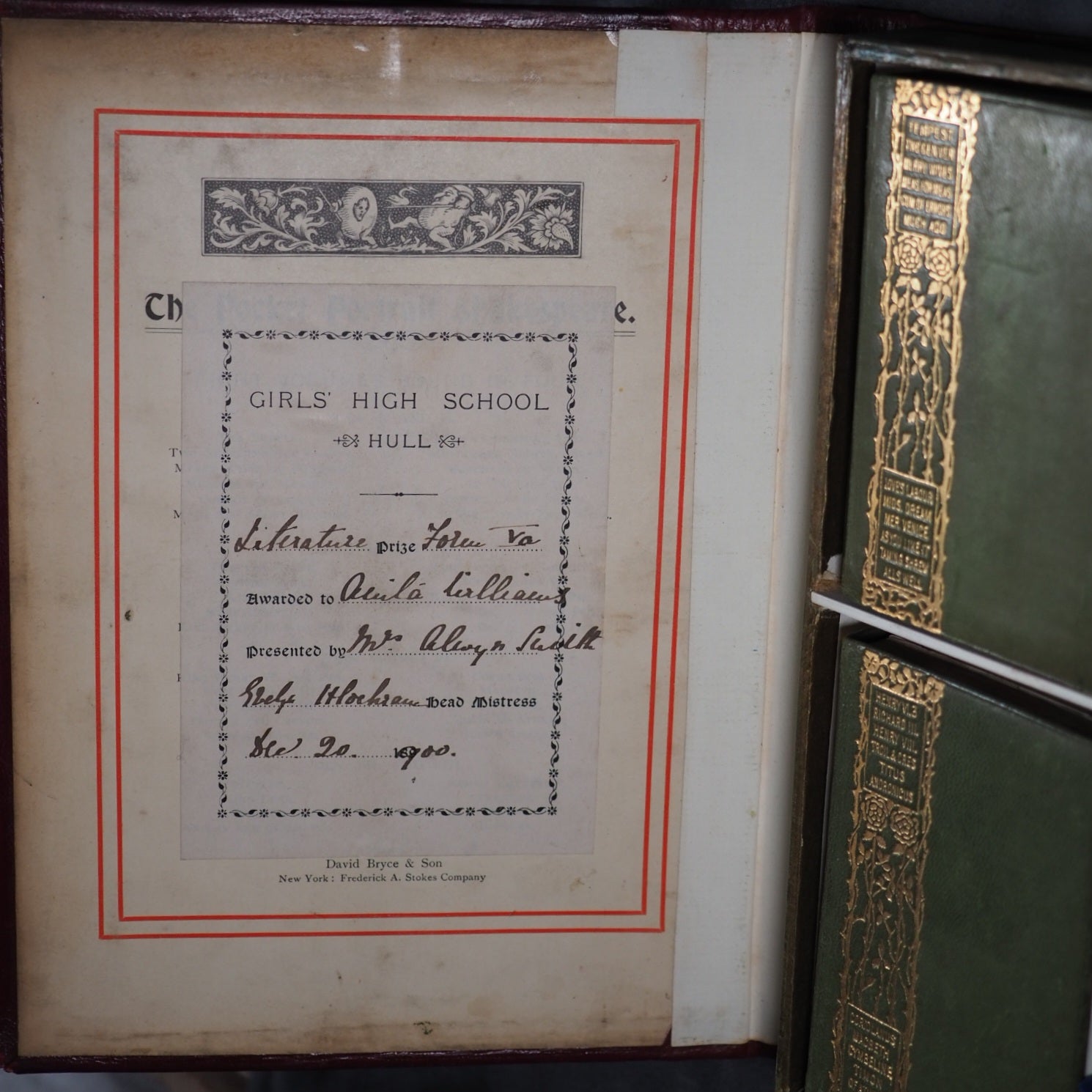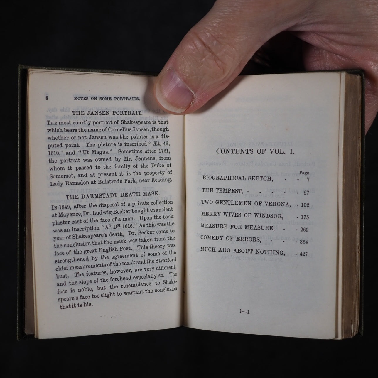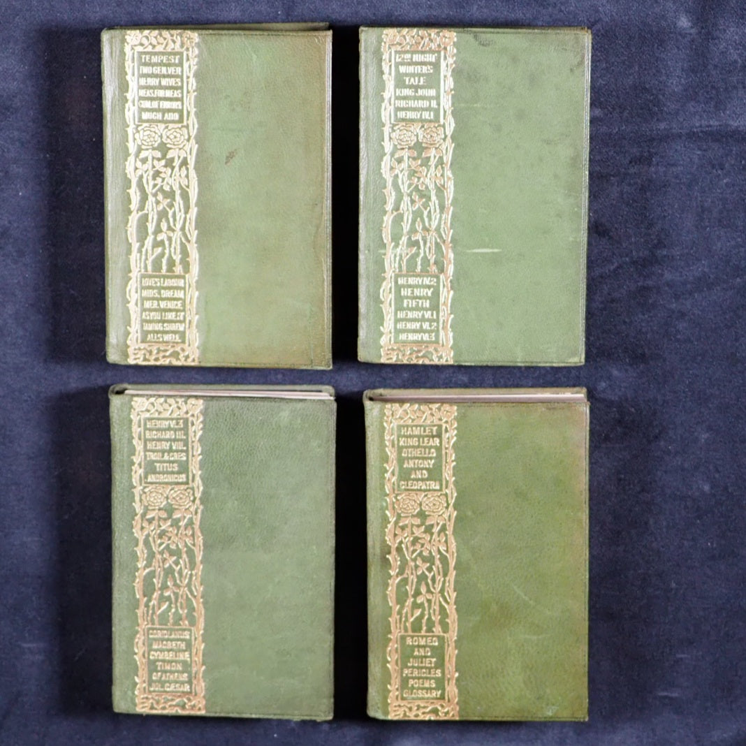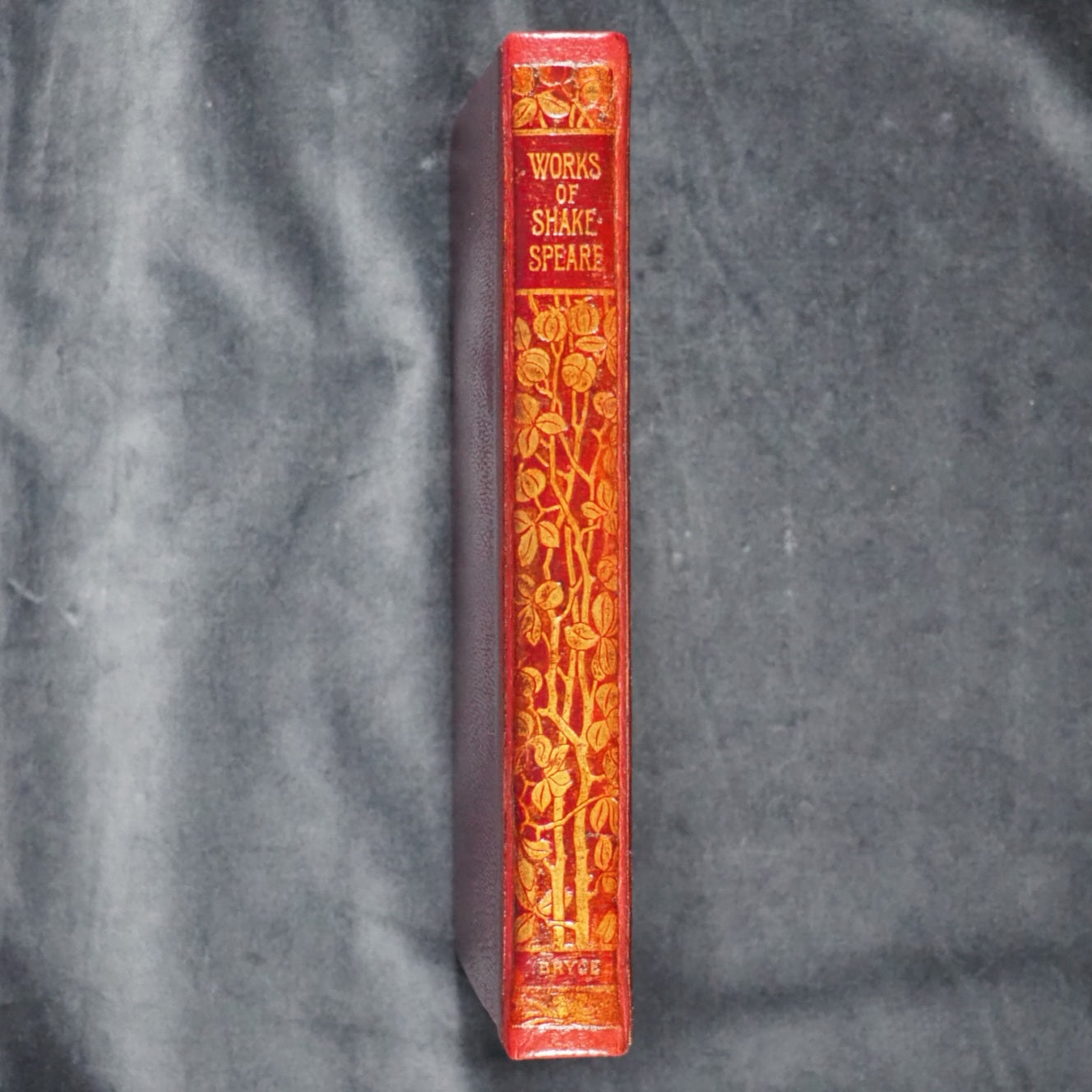 Shakespeare, William Pocket Portrait Shakespeare. Complete with glossary. Bryce, David & Sons. Glasgow. Circa 1899. India paper.Title pages printed in red and black. With an essay, Notes on some portraits of William Shakespeare by W.S. Brassington. Printed by Robert MacLehose & Co. University Press, Glasgow. Eight volumes in four, housed in a book-shaped box. Each book with its own compartment. Vols.i & ii : 516, 534 printed pages - Tempest; Two Genlemen Of Verona; Merry Wives Of Windsor; Comedy Of Errors; Much Ado About Nothing; Love's Labour Lost; Midsummer Night's Dream; As You Like It; Taming Of The Shrew; All's Well That Ends Well. Vols. iii & iv : 482, 496 printed pages - Twelfth Night; Winter's Tale; King John; King Richard II; King Henry IV, First Part; King Henry IV, Second Part; King Henry VI, First Part; King Henry VI, Second Part; King Henry VI, Third Part. Vols. v & vi : 490, 508 printed pages - King Henry VI, Third Part (Continued); King Richard III; King Henry VIII; Troilus And Cressida; Titus Andronicus; Coriolanus; Macbeth; Cymbeline; Timon Of Athens; Julius Caesar. Vols. vii & viii : 499, 521 printed pages - Hamlet; King Lear; Othello; Antony and Cleopatra; Romeo and Juliet; Pericles; Miscellaneous Poems; Index to Current Shakespearian Phrases; Glossary. Original black endpapers. All edges gilt. 70 x 100 mm. Original polished green calf. Gilt titles and decoration to each front board and spine ( light rubbing to edges and a few small blemishes). The book box measures: 6.5 x 9.0 x 1.0. Maroon straight-grained morocco with early reback, preserving the original spine. Gilt title and decoration to both the front board and spine. Marbled side panels (impersonating the paged edges of a book). Inner hinges carefully strengthened. Late prize label: Girls High School. Awarded to Amelia Williams Dec. 20 1900. Not in Bondy, nor Garbett, nor Spielmann, nor Welsh. OCLC, 54361151. WorldCat locates 4 copies worldwide including only one in the UK (National Libray of Scotland). 128 firsts2024