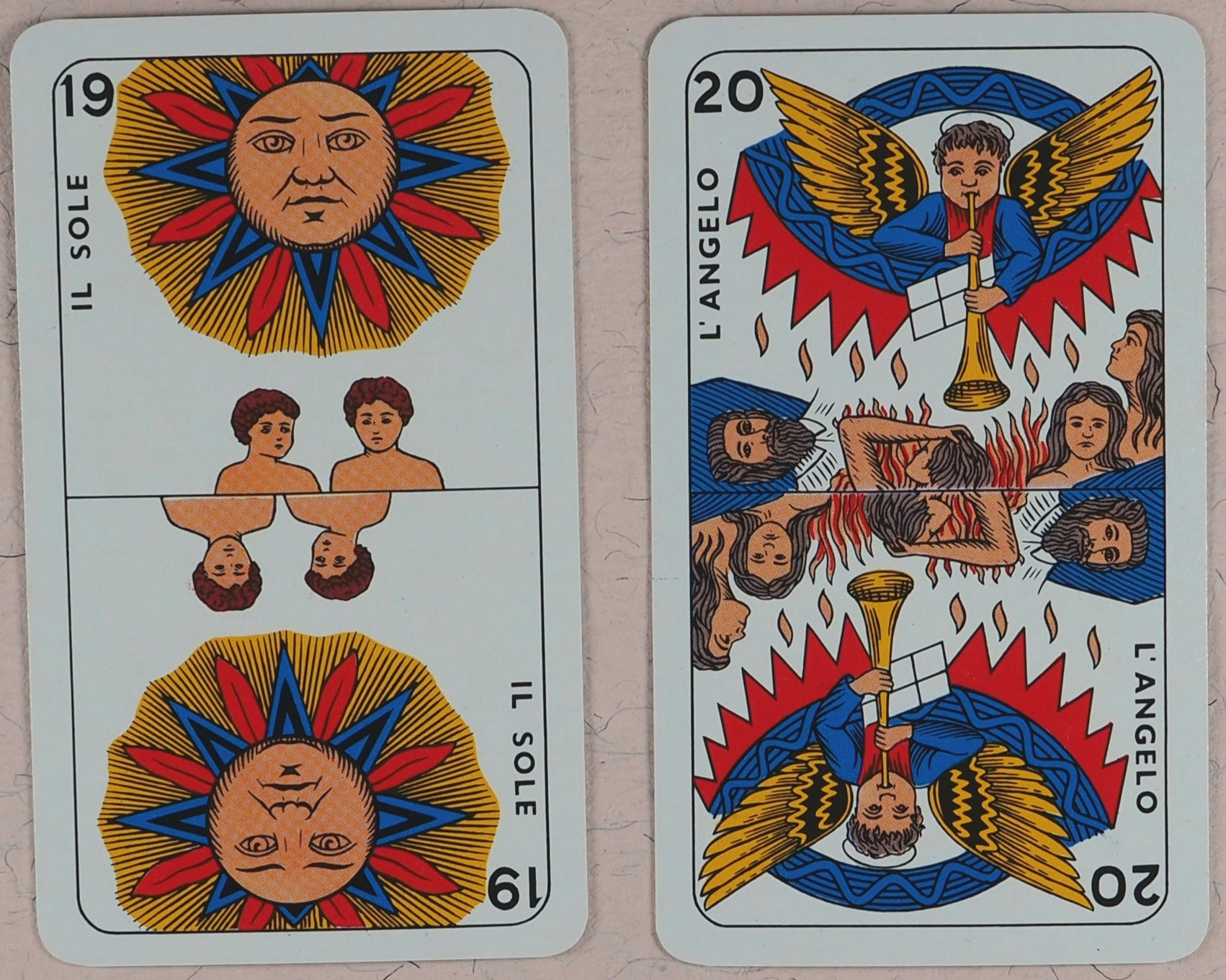 Full-colour cards with rounded corners. 62 x 107 mm. The backs have white traditional geometric pattern on a blue ground.