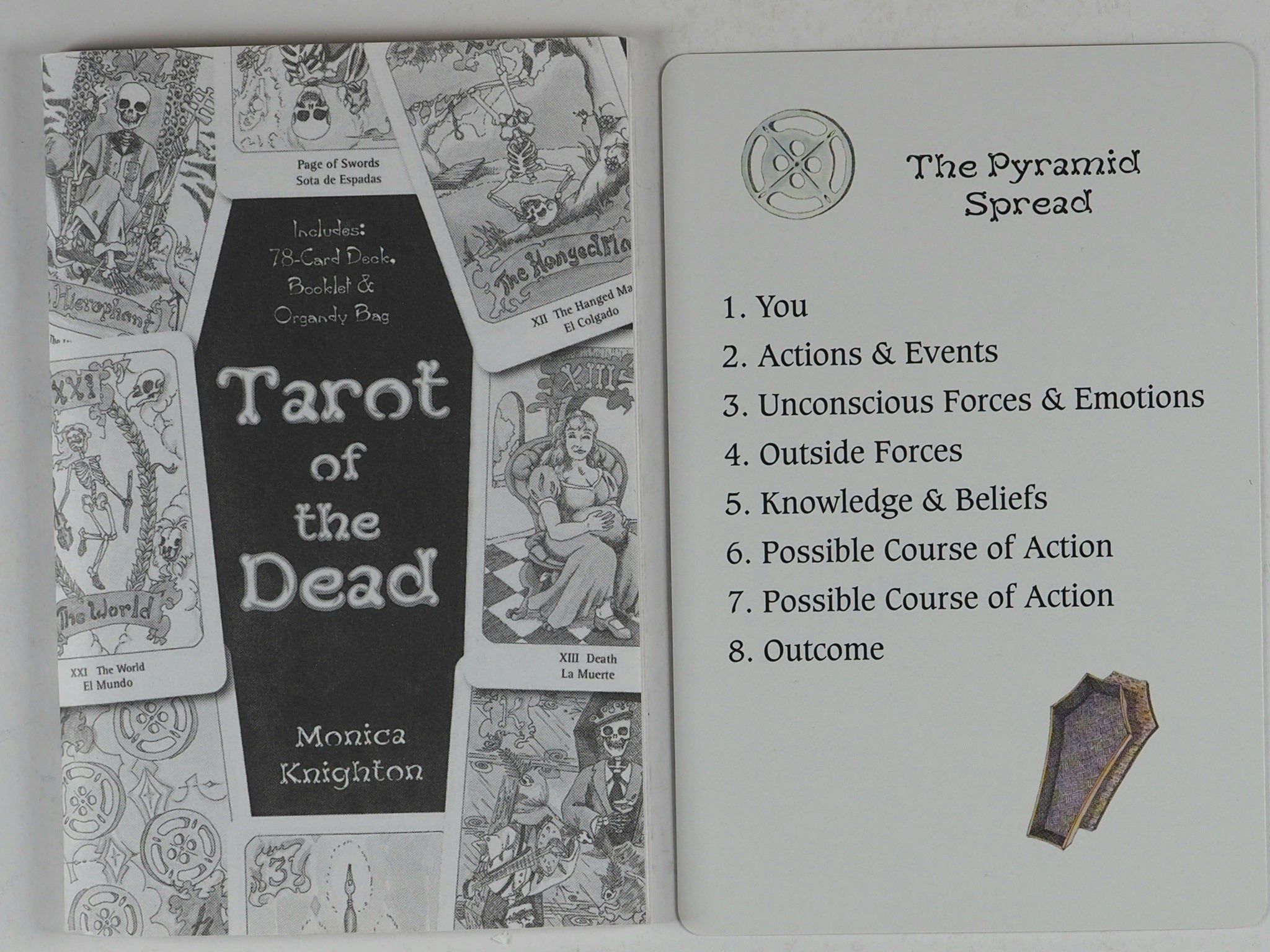 Complete 78 card Tarot of the Dead by Monica Knighton. Contains 22 Major Arcana and 56 Minor Arcana cards in the style of traditional November Mexican 'Day of the Dead' or 'Dia de los Muertos'. Printed in U.S.A..
