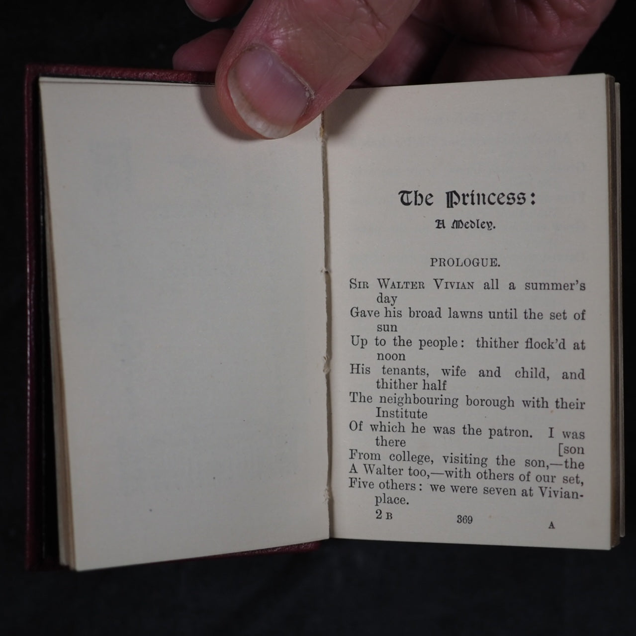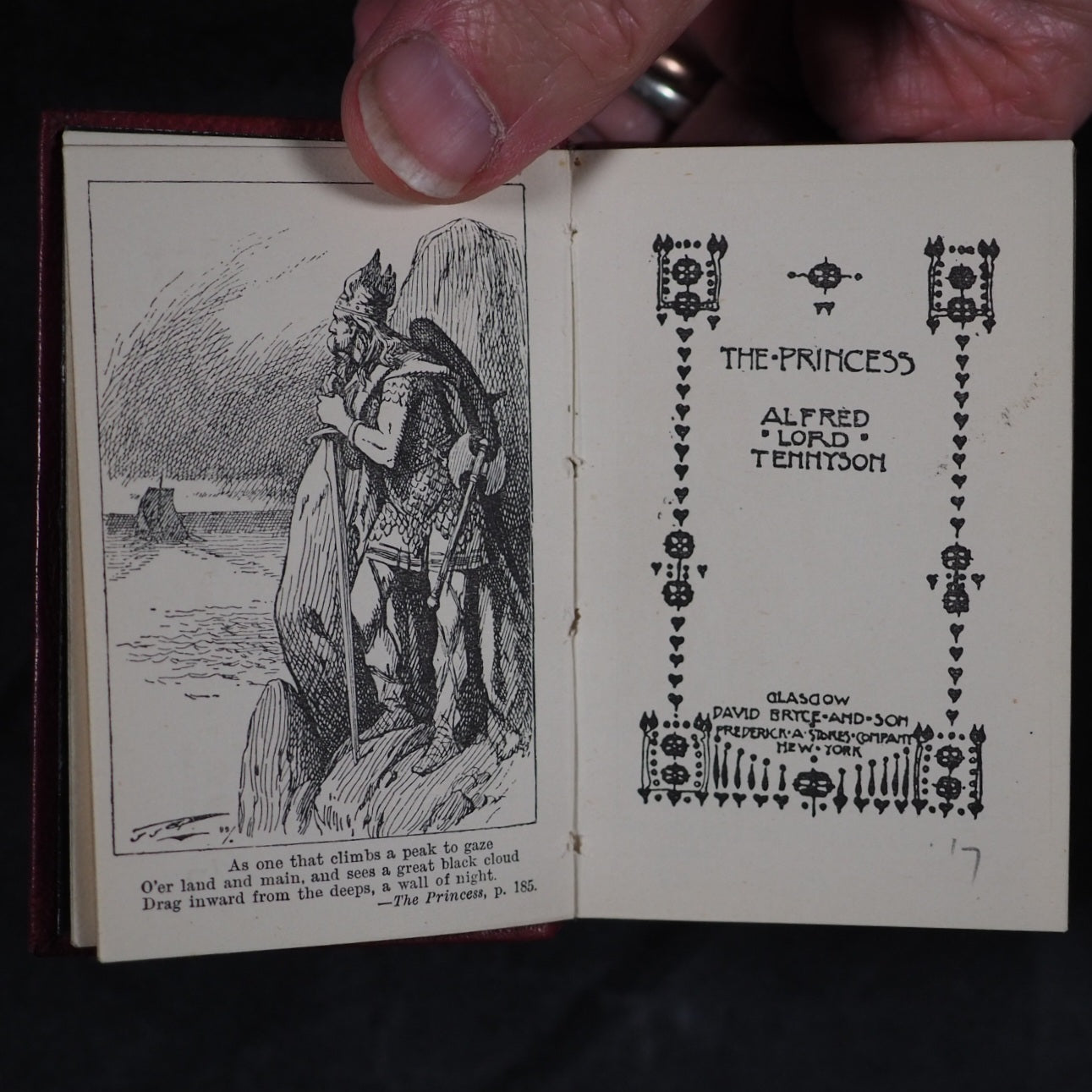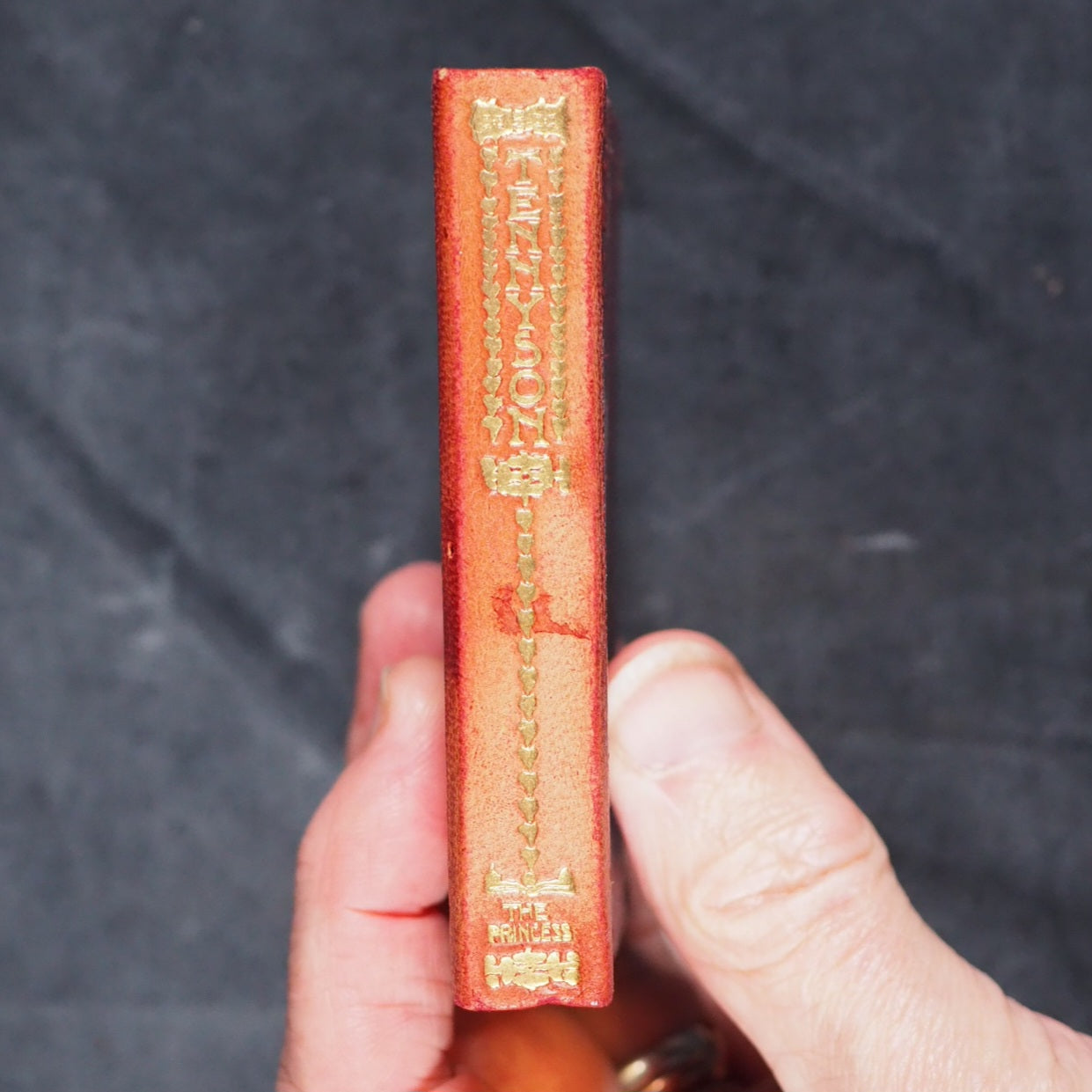 Tennyson, Alfred Lord. Princess, The. Bryce & Son. Glasgow. Circa 1889. 215 printed pages (Pages numbered 369-583). Frontispiece. Binding design & title page by Jessie M King. Dainty Little Library series, 75. Original black endpaper. 60 x 90 mm. Original publisher's burgundy calf. Gilt lettering within art nouveau style decorative borders. Tiny area of loss on front cover. The Dainty Little Library saw Bryce re-packaging around thirteen or so classics from the Golden Thoughts and Tartan Series, with art-nouveau re-designed title pages and bindings by Jessie Marion King (1875-1949), a Scottish female children’s book illustrator of high esteem. Volumes 1-5 were Lord Tennyson’s works. 6 and 7 were by Walter Scott. 8 and 9 were Robert Burns title. 10 to 12 were by Wordsworth, Thomas Moore, and Macaulay respectively. All in attractive limp leather bindings of harlequin colours. Garbett, 49. Welsh, 4758. OCLC, 1394583887. WorldCat locates two copies worldwide (british Library and National Library of Scotland). 138 firsts2024