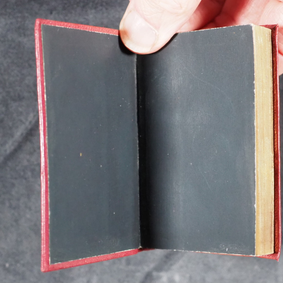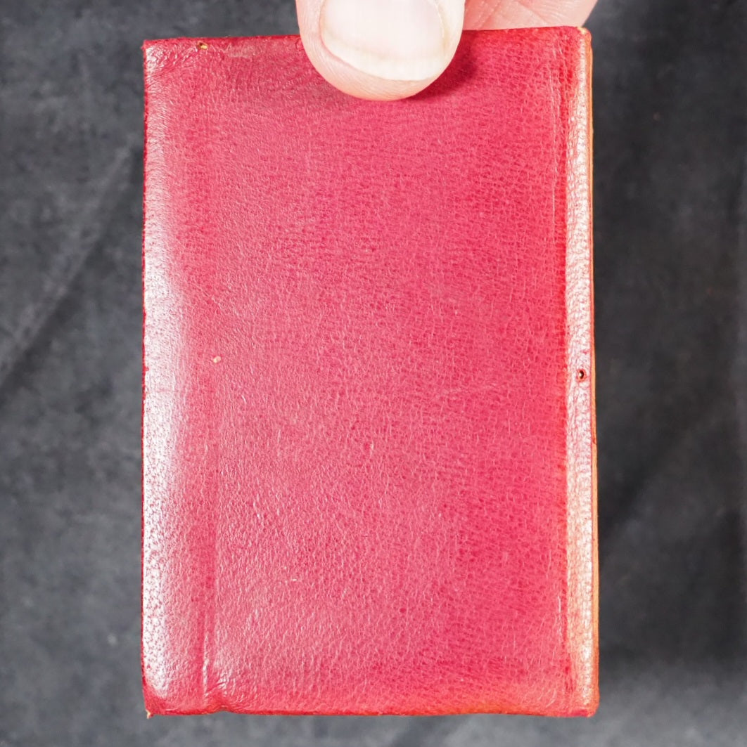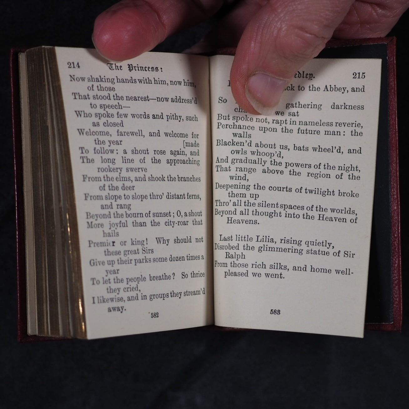 Tennyson, Alfred Lord. Princess, The. Bryce & Son. Glasgow. Circa 1889. 215 printed pages (Pages numbered 369-583). Frontispiece. Binding design & title page by Jessie M King. Dainty Little Library series, 75. Original black endpaper. 60 x 90 mm. Original publisher's burgundy calf. Gilt lettering within art nouveau style decorative borders. Tiny area of loss on front cover. The Dainty Little Library saw Bryce re-packaging around thirteen or so classics from the Golden Thoughts and Tartan Series, with art-nouveau re-designed title pages and bindings by Jessie Marion King (1875-1949), a Scottish female children’s book illustrator of high esteem. Volumes 1-5 were Lord Tennyson’s works. 6 and 7 were by Walter Scott. 8 and 9 were Robert Burns title. 10 to 12 were by Wordsworth, Thomas Moore, and Macaulay respectively. All in attractive limp leather bindings of harlequin colours. Garbett, 49. Welsh, 4758. OCLC, 1394583887. WorldCat locates two copies worldwide (british Library and National Library of Scotland). 138 firsts2024