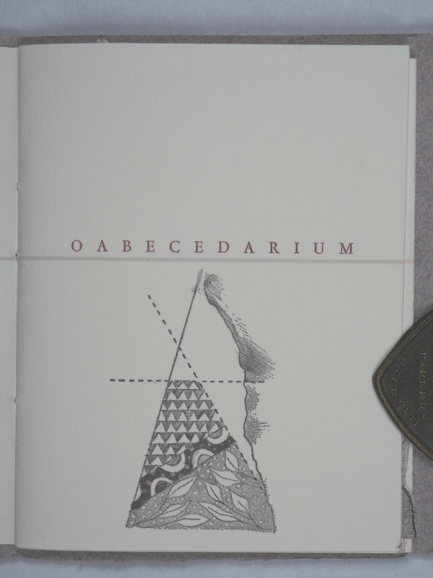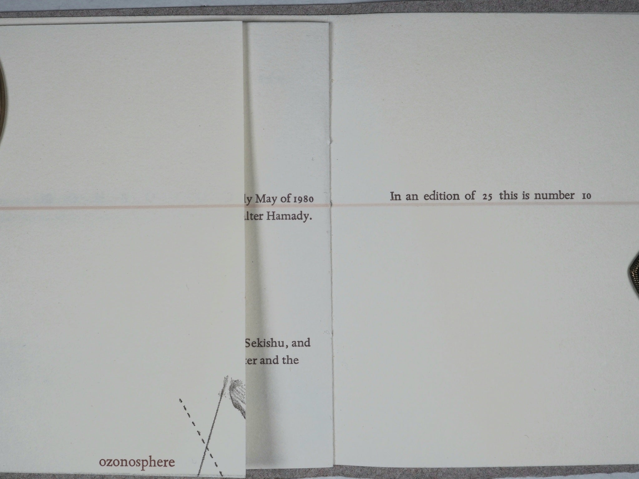 24 pages that feature fold-outs, flaps, and shaped edges. All of the words in the text begin with the letter 'o.' "This vast well of information was completed in early May of 1980 under the scholarly guidance and nimble wit of Walter Hamady. Spectrum type was used throughout on Kitikata, Sekishu, and Rives papers; Covers were handmade by the printer and the amazing Walter Tisdale. In an edition of 25 this is number 109 x 116 mm. Soft folded cover sewn to single signature. Joan Flasch Artists' Book Collection. Barbara Tetenbaum and Walter Tisdale are UW-Madison alumni. OCLC 7728092. WorldCat records three copies worldwide (Chicago, Vermont Howe, Wisconsin). The illustrations were created using stencils, string, and other found objects during the printing process. This hands-on, experimental approach to image-making is a hallmark of the artist's style and a key feature of the book's visual appeal. Tetenbaum designed the book to direct the reader's gaze to different locations on the pages. This challenges the conventional, linear act of reading and encourages the reader to physically interact with the book, making them an active participant in the experience. The work features musings on both Tetenbaum herself and her father, adding a layer of personal narrative to the abstract and structural experiments. Published under Tetenbaum's Triangular Press imprint in 1980, this is an early work by an artist who has since become a key figure and influential educator in the contemporary book arts field.
