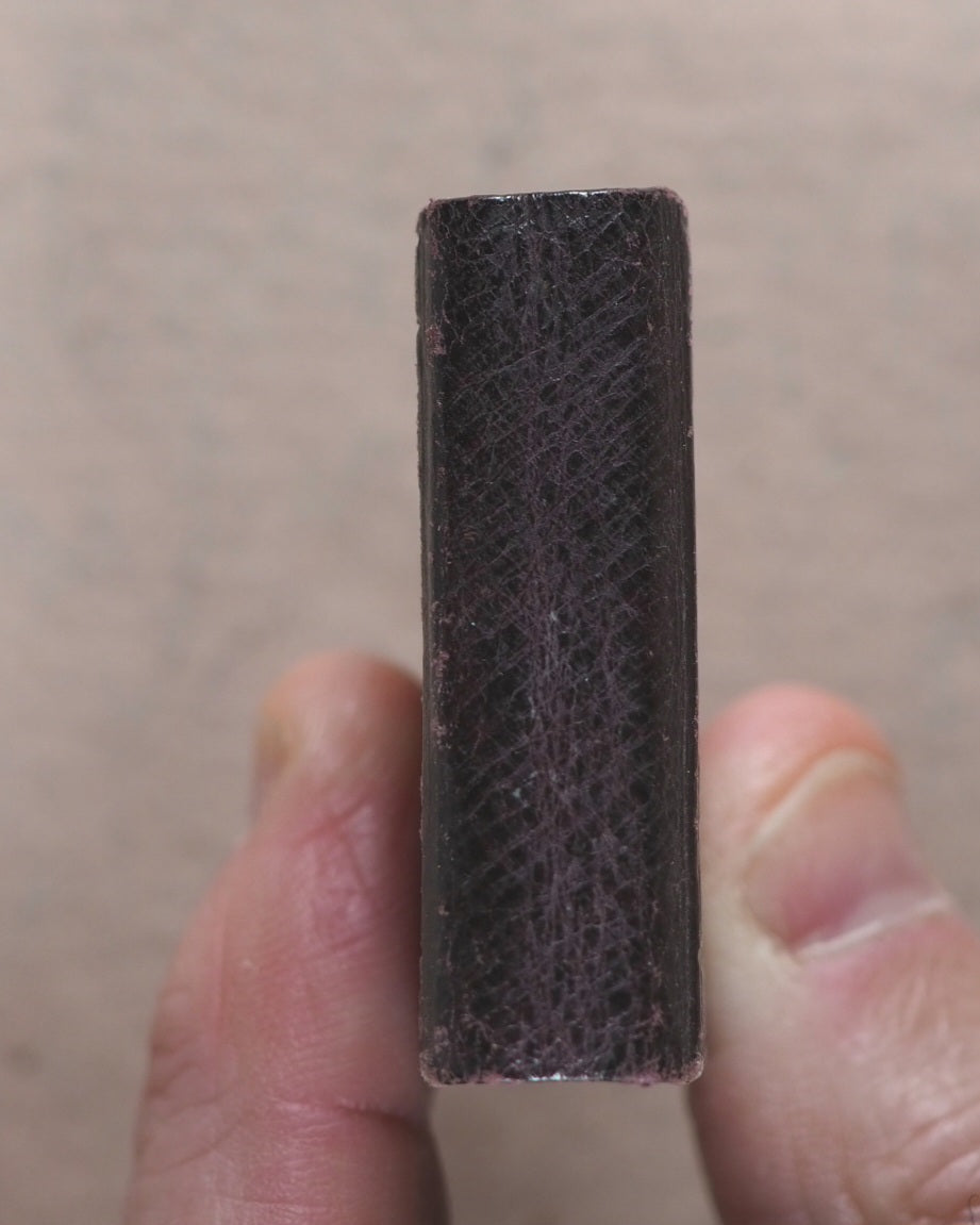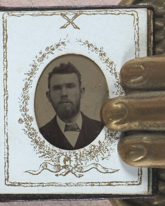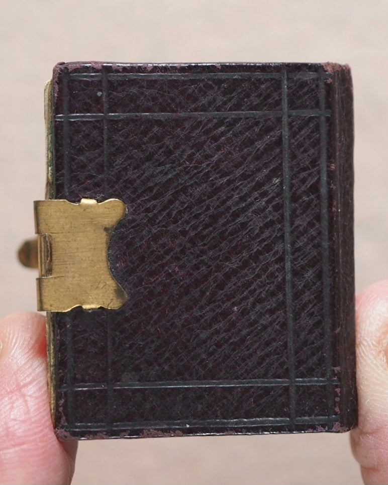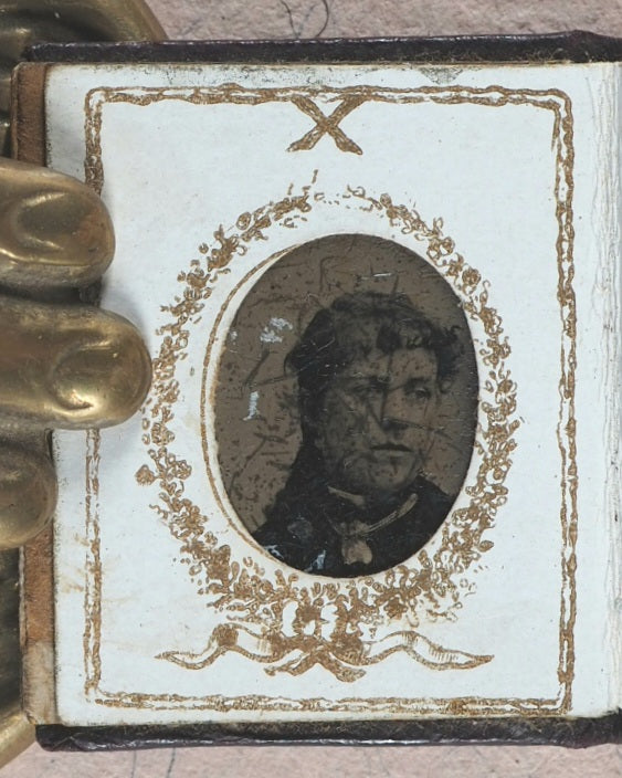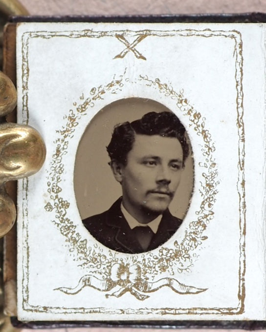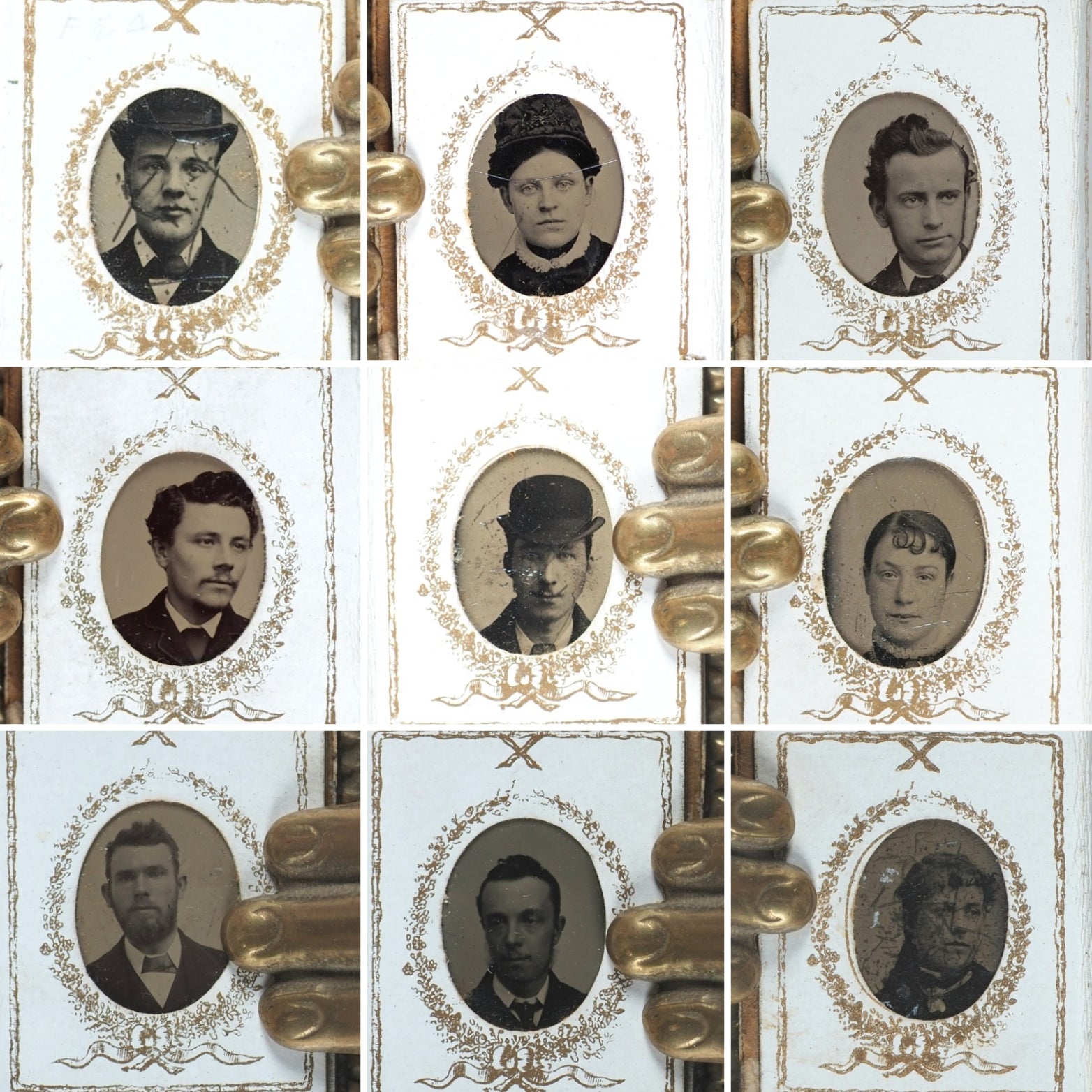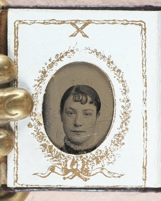11 black and white formal Victorian head and shoulder portraits - 8 males, 2 of them with hats; 3 females, one with a bonnet. Several of the men have a - perhaps borrowed -starched collar but no ties, and one has a thin chain with a horseshoe pendant. The women are not wearing or at least not making a show of having any jewellery in the shots. This album appears to have been a relatively cheap indulgence for a family of diminutive prosperity; as such, its survival today is unexpected amd slightly uncommon. Dated '1880' in pencil on reverse of first photographic image. Some slight deterioration, oxidation and crackling on the slightly reflective top layer. In heavy card frames, each with ribbons, garlands, borders, and an 'X' above the oval apertures. One aperture at the back is vacant. 44 x 35 mm. Contemporary full dark chocolate morocco with original simple brass clasp and catch plate; blind embossed mitred covers.