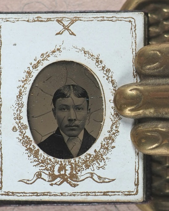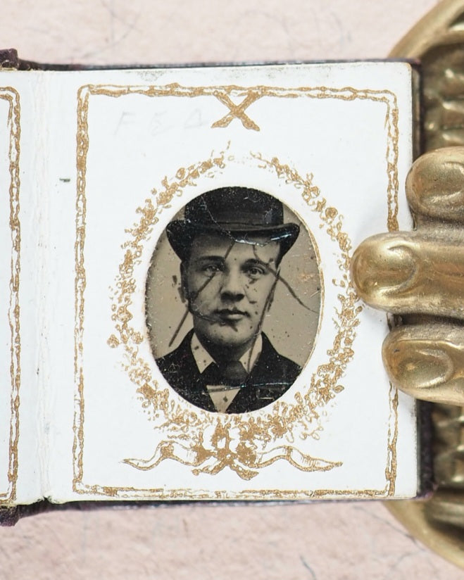 Inexpensive, and quick, ferrotypes became known as “tintypes” due to the tin-like feel of the metal base -popular at fairs and with the stigma of being “lower class” photographs - and successor to the ambrotype. The first tintypes were in 1849, so the date of 1880 for this album is perfectly credible. The metal base layer is most likely a very thin iron plate, coated with a binder layer of collodion and an image material layer of silver nitrate. The exposure process would have taken from several seconds to a few minutes; the resulting photographs are sharp images despite a low colour contrast.