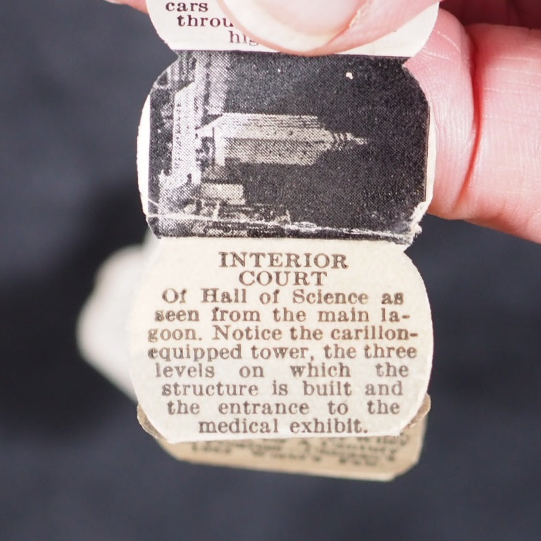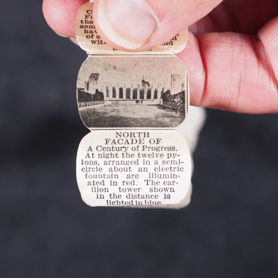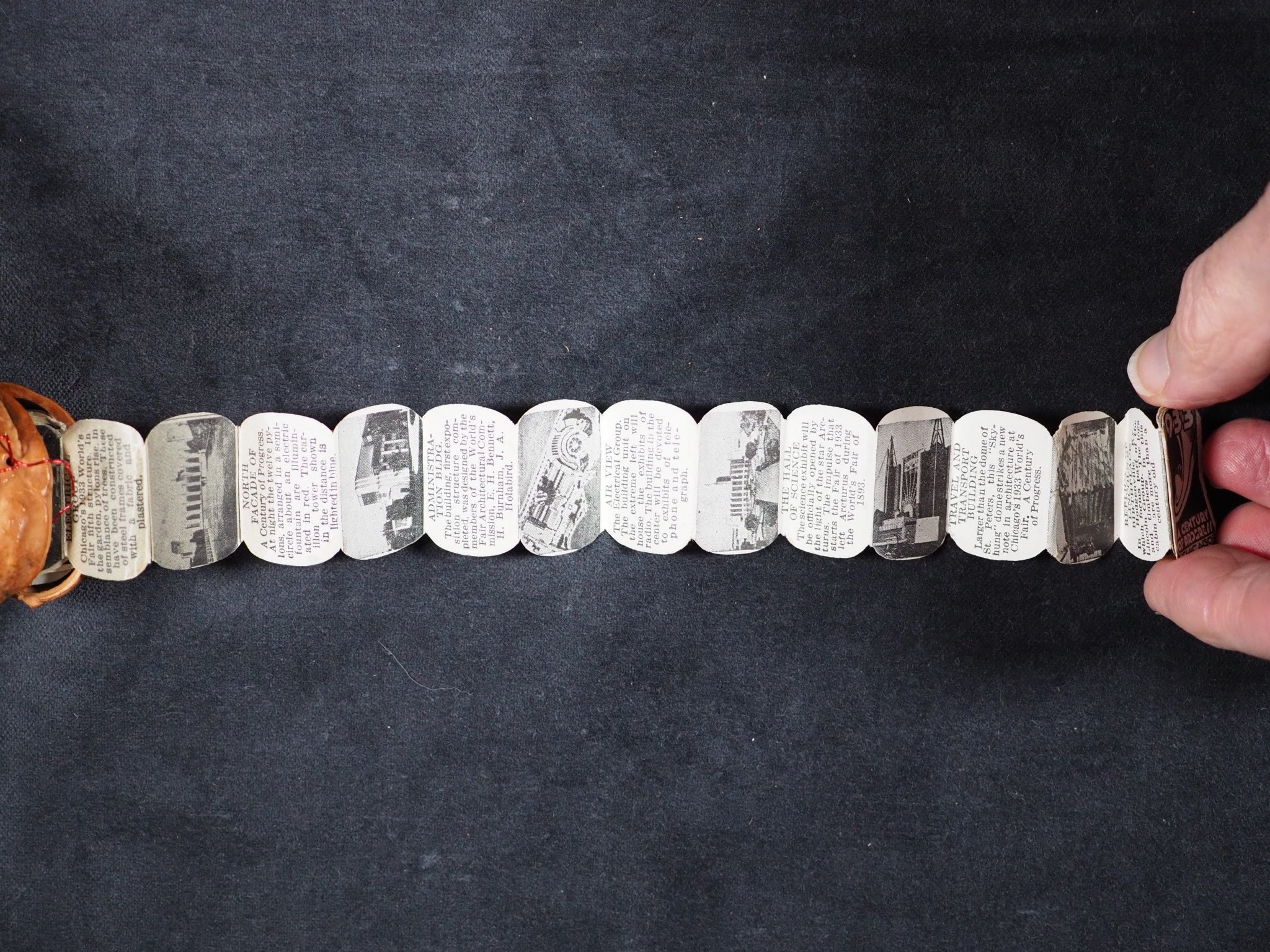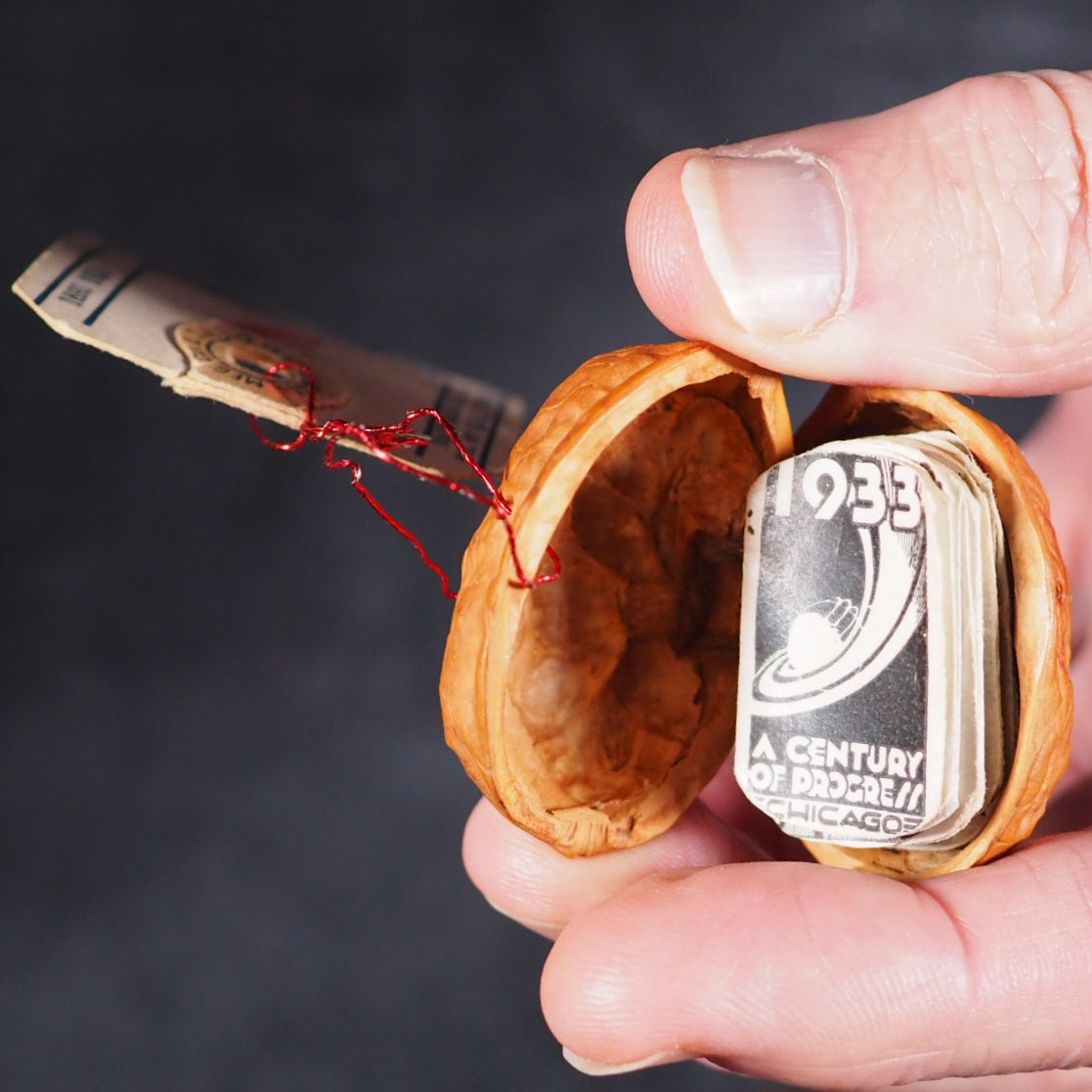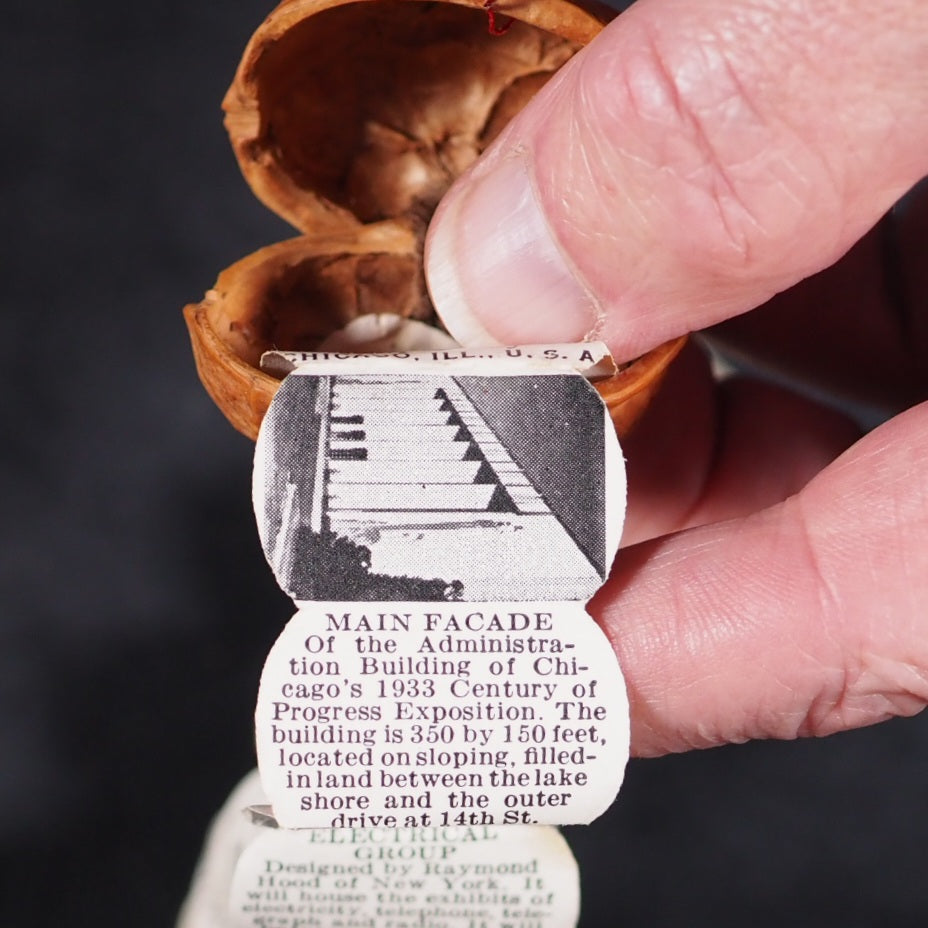 World's Fair in a Nutshell. A Century of Progress. Gale Specialty Co. Chicago. 1932. Concertina strip of 40, alternating photographs and text, printed to one side only (‘a pull-out accordion booklet of pictures and descriptions of important architectural works from the fair’). 25 x 20 mm. Oily spot for about 10 pages in the middle but just a bit discolouring the paper. Housed in a real walnut shell, measures approx 40 mm., sewn on one side, with red wire closure. With the original colour-printed paper mailing tag, filled out. This thing was mailed from Chicago to New York, today it would just get lost in the mail. Illawarra Historical Society mentions the only other copies I can trace https://tinyurl.com/5x4wy2ph . A rare surviving souvenir/tourism item from a exhibition event or agricultural show in the early 1932 original walnut shell. 140 firsts2024