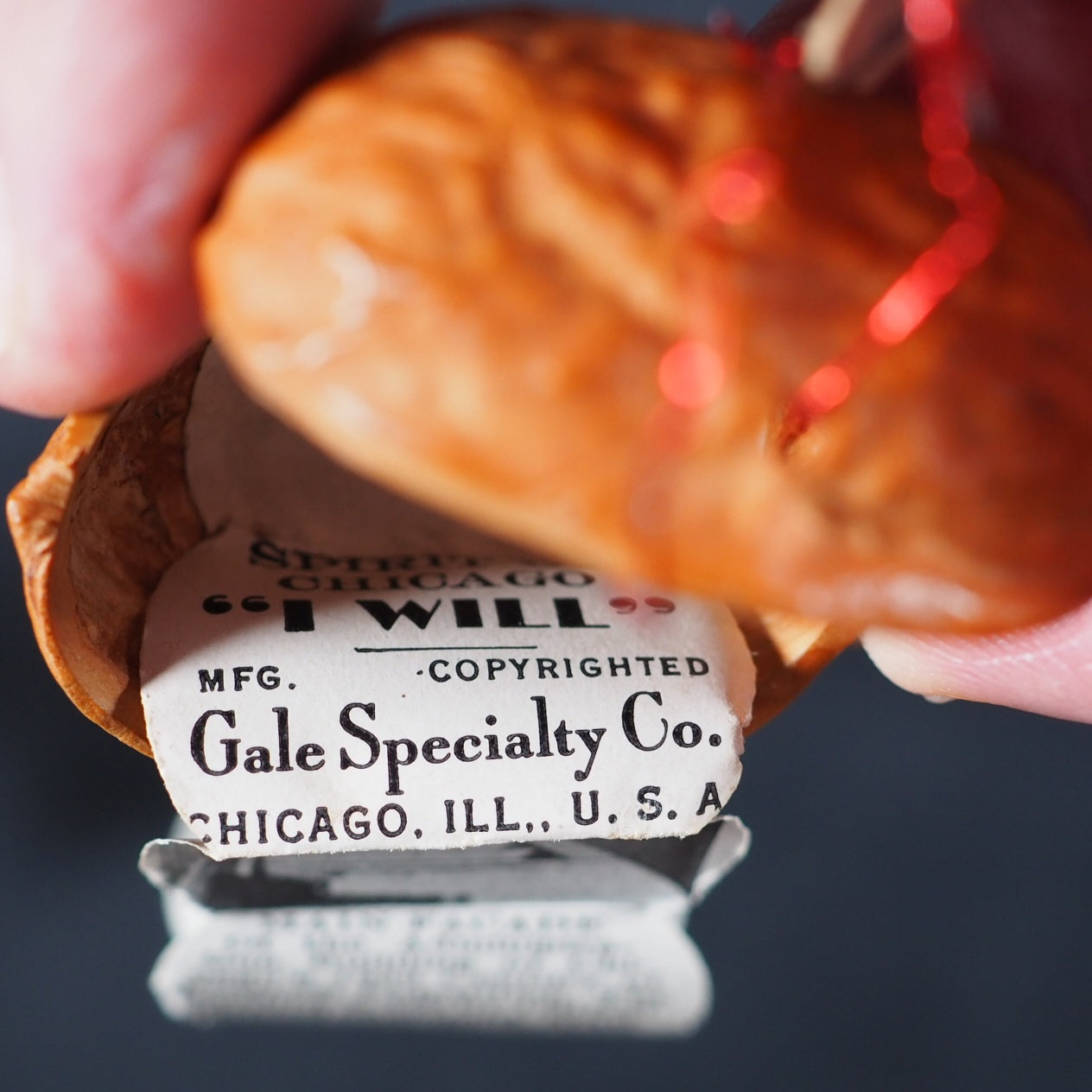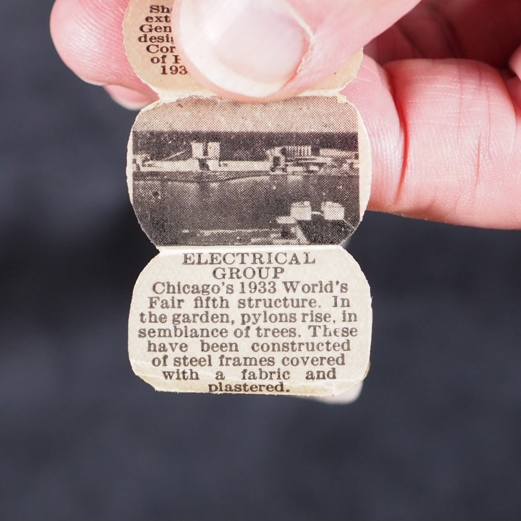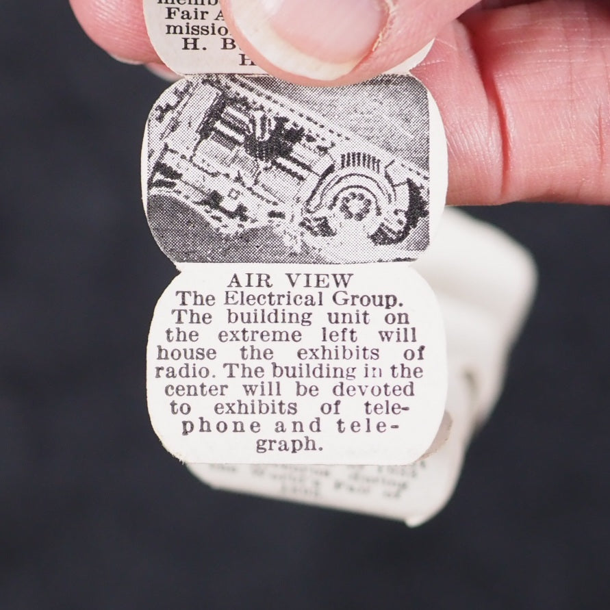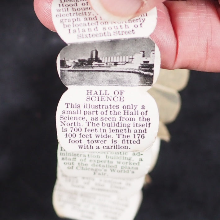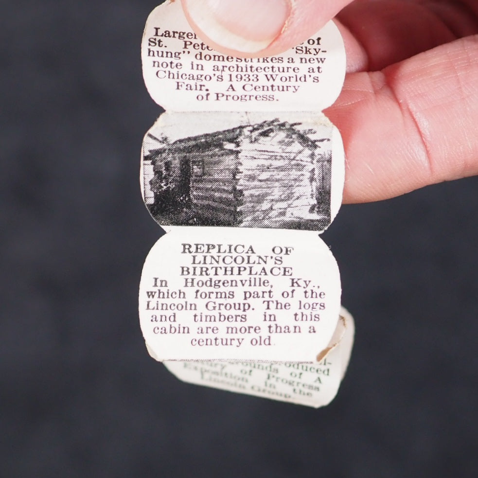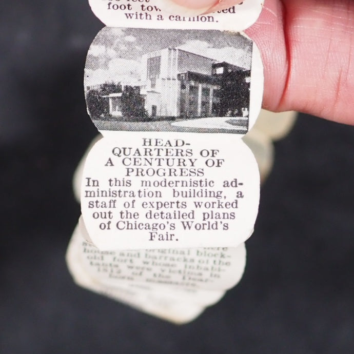 World's Fair in a Nutshell. A Century of Progress. Gale Specialty Co. Chicago. 1932. Concertina strip of 40, alternating photographs and text, printed to one side only (‘a pull-out accordion booklet of pictures and descriptions of important architectural works from the fair’). 25 x 20 mm. Oily spot for about 10 pages in the middle but just a bit discolouring the paper. Housed in a real walnut shell, measures approx 40 mm., sewn on one side, with red wire closure. With the original colour-printed paper mailing tag, filled out. This thing was mailed from Chicago to New York, today it would just get lost in the mail. Illawarra Historical Society mentions the only other copies I can trace https://tinyurl.com/5x4wy2ph . A rare surviving souvenir/tourism item from a exhibition event or agricultural show in the early 1932 original walnut shell. 140 firsts2024