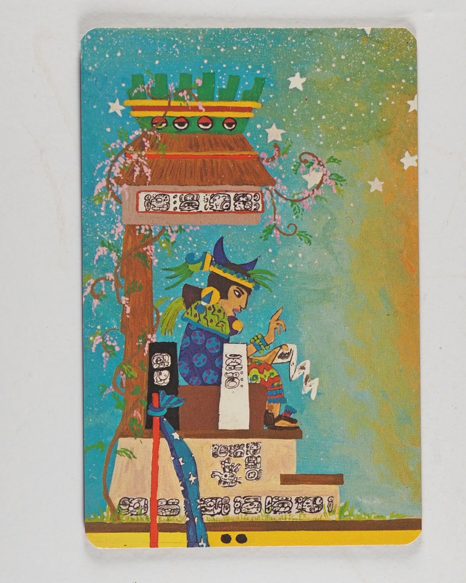 "Xultun Tarot Pronounced Shoul-toun, the Xultun tarot deck was painted by Peter Balin based upon sketches drawn by the artist at Tikal, Guatemala, during the summer of 1972. Much of the card imagery reflects the beliefs and customs of pre-Columbian Indians, especially the Maya" (Stuart Kaplan, pages 287-9, Encyclopedia of Tarot, 1978).